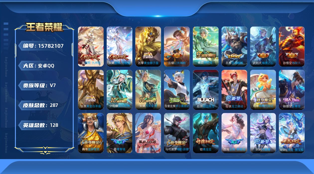 [15782107]安卓Q-V7-最强王者段位-128英雄-287皮肤-1典藏英雄-9传说-74史诗