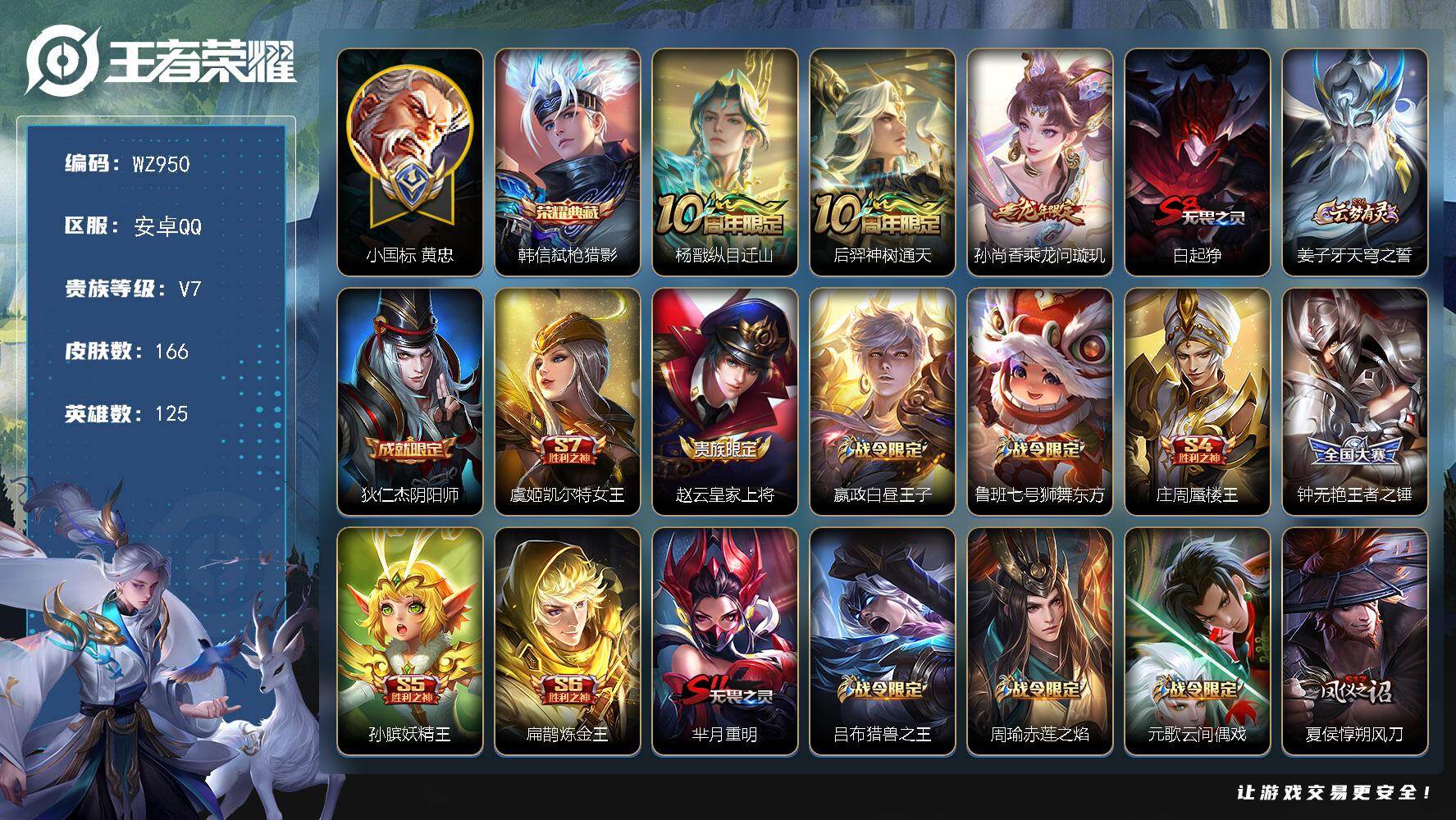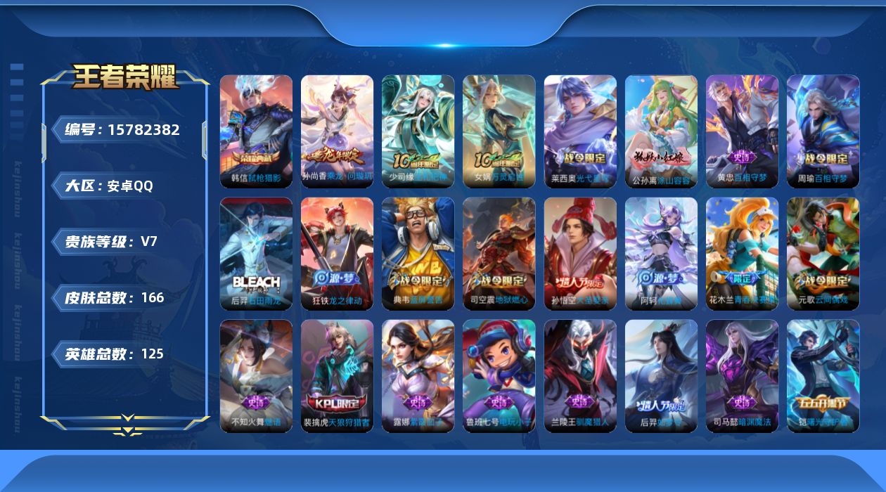 [15782382]安卓Q-V7-最强王者段位-125英雄-166皮肤-1典藏皮肤-3传说-44史诗
