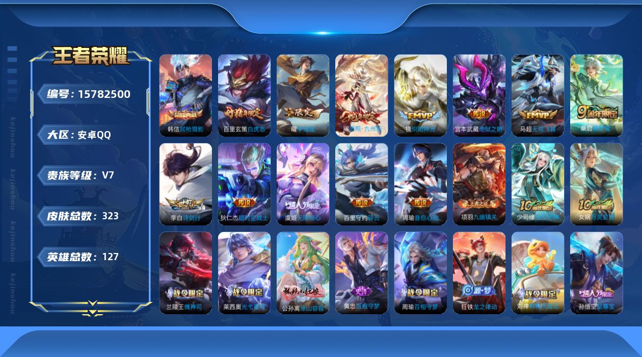 - [11935009]V10 5典藏 5无双 8珍品传说 64传说 125英雄 509皮肤 可修改实名 优质装备:鸣剑·曳影,全息碎影(猴子典藏),九霄神辉(木兰典藏),银白咏叹调(倪克斯侍卫),弑枪猎影(韩信典藏),真我赫兹(瑶)(瑶无双),小乔时之魔女(小乔无双),韩信群星魔术团(韩信无双),器灵·螭龙剑,天机白泽,江户川柯南,怪盗基德,器灵·落星盏,酷洛米之心,大耳狗之梦,朽木白哉,黑崎一护,黄金狮子座,黄金射手座,冠军飞将,云鹰飞将(小将军),绛天战甲(鸡嘴战神),猫影幻舞,久胜战神,炽阳神光,一念神魔,末日机甲-孙尚香(绿蚂蚱),地狱火,仲夏夜之梦(大飞蛾),音你心动-小乔,零号·赤焰,海洋之心,地狱之眼,音你心动-周瑜,胖达荣荣,李逍遥,乞巧织情,时之恋人-刘备(电焊工),淬星耀世,超时空战士-狄仁杰,末日机甲-孙策,挚爱之约,无双飞将,音你闪耀(rap皮),碎云,浮生妄,记忆之芯(机甲兔),妄想实况,妄想奇谈,惊梅引,澜逐花归海,艾琳觅芳踪,千劫归真,诡秘之主,千山共赴,涂山容容 珍品传说:时之奇旅-孙策 传说皮:典韦战鼓燎原,落雪白狼,死亡执政官,九山相柳,星之鸣奏,祥瑞亨通,幻光神枪 珍宝阁皮:万物之道,蔷薇恋人,女武神 限定皮:愿照·九州拓(澜年限),愿照·福禄聚(蔡文姬年限),愿照·岁时盈(虞姬年限),愿照·山河定(司空震年限),愿照·众生和(妲己年限),愿照·千秋盛(女娲年限),逐霄战戟,鸣野蒿,至尊宝,白虎志(电光耗子),武陵仙君(小桃花),傲雪梅枪,绯月行,白鹤梁神女,时雨天司(水龙头),神威(电光马子),飞衡(韩信年限),山海·碧波行(瑶年限),至美·乘鲤谣,至美·化雀舞,遇见飞天,高山流水,诗剑行,怒海麟威,五谷丰年,武圣,游园惊梦,梁祝,逐梦之翼,天狼溯光者,虎魄,天狼征服者,天狼绘梦者,李小龙,逐梦之影,朱雀志(守约年限),永曜之星,辉光之辰,孙行者,猪悟能,大圣娶亲,引擎之心,乒乒小将,蜜橘之夏,寅虎·御盾(廉颇年限),百木心枪,玉兔公主,启示之音,深海之息(深海大菠萝),山海·玄木吟(马可年限),冰霜神祇 史诗皮:赞萌露比,鸭鸭历险记-刘禅,苍鳞隐世,器灵·浮梦炉,糖绘人间,瑰影绮梦,化蝶舞,灵蛊蚀心,星界战将,龙之律动,雪豹·霜爪,布丁狗之誓,小牛鸭,石田雨龙,百相守梦-周瑜,戍鼓铭心,茶境仙,幻珠鲛人,怒海争锋,破空之剑,战舞者,涂山红红,
