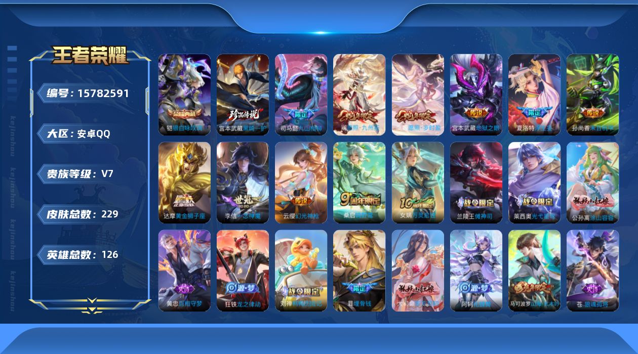 [15782591]安卓Q-V7-最强王者段位-126英雄-229皮肤-1典藏皮肤-1珍品传说-11传说-61史诗