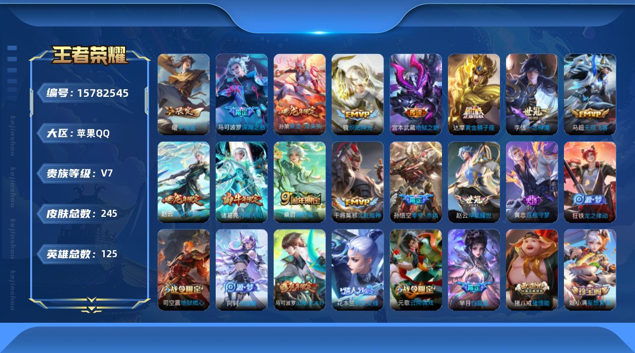[15782545]差几次出水晶 苹果Q-245皮肤-14传说-63史诗 【英雄全皮】:影全皮 【传说皮肤】:桑启鸣野蒿,孙策乘龙淬吴钩,赵云乘龙铭钟鼎,马可波罗深海之息,马超无双飞将,赵云淬星耀世,曜李逍遥 ,诸葛亮时雨天司,镜炽阳神光,孙悟空零号赤焰,李信一念神魔,干将莫邪久胜战神,达摩黄金狮子座,宫本武藏地狱之眼 【限定皮肤】:蒙犽顽岩魄,姜子牙天穹之誓,杨戬破阵退雄兵,狄仁杰阴阳师,赵云皇家上将,墨子神迹守卫,高渐离玩趣恶龙,芈月白晶晶,元歌云间偶戏,马可波罗深海之息,马可波罗山海玄木吟,狄仁杰魔术师,狄仁杰万华元夜,达摩沙漠行僧,项羽海滩派对,老夫子醍醐杖,老夫子航海奇遇记,程咬金演武夺筹,兰陵王金庭之子,花木兰默契交锋,亚瑟潮玩骑士王,孙悟空零号赤焰,李元芳云中旅人,钟馗驱傩正仪,雅典娜黎明之约,鬼谷子原初探秘者,鬼谷子五谷丰年,诸葛亮时雨天司,苏烈千军破阵,梦奇顽趣,沈梦溪大漠名商,裴擒虎擒涛扼浪,猪八戒猪悟能,曜李逍遥 ,西施玲珑珍味,鲁班大师探海日志,桑启海盐诗旅,戈娅驭风魔法,艾琳流音漫舞,司空震地狱燃心,阿古朵江河有灵,张良古海寻踪,蒙犽百解令,高渐离燃音魔法,妲己灵卜魔法,鬼谷子天穹祈灯,姬小满妄想食味,孙策乘龙淬吴钩,赵云乘龙铭钟鼎,刘邦剑破天穹,程咬金群星魔术团,周瑜熔金海岸 【年限皮肤】:诸葛亮时雨天司,马可波罗山海玄木吟,孙策乘龙淬吴钩,赵云乘龙铭钟鼎 【赛季限定】:狄仁杰万华元夜,达摩沙漠行僧,老夫子醍醐杖,程咬金演武夺筹,兰陵王金庭之子,张良古海寻踪,李元芳云中旅人,钟馗驱傩正仪,雅典娜黎明之约,鬼谷子原初探秘者,苏烈千军破阵,梦奇顽趣,沈梦溪大漠名商,裴擒虎擒涛扼浪,鲁班大师探海日志,桑启海盐诗旅,鬼谷子天穹祈灯,刘邦剑破天穹,姜子牙天穹之誓 【战令限定】:墨子神迹守卫,元歌云间偶戏,老夫子航海奇遇记,艾琳流音漫舞,亚瑟潮玩骑士王,西施玲珑珍味,司空震地狱燃心,戈娅驭风魔法,高渐离燃音魔法,妲己灵卜魔法 【史诗皮肤】:鲁班七号电玩小子,赵云皇家上将,赵云未来纪元,貂蝉圣诞恋歌,甄姬冰雪圆舞曲,王昭君偶像歌手,狄仁杰魔术师,廉颇地狱岩魂,宫本武藏鬼剑武藏,孙尚香水果甜心,嬴政摇滚巨星,妲己魅力维加斯,妲己女仆咖啡,墨子金属风暴,吕布圣诞狂欢,曹操幽灵船长,李白千年之狐,吕布末日机甲,张飞乱世虎臣,韩信白龙吟,花木兰水晶猎龙者,刘邦德古拉伯爵,夏侯惇