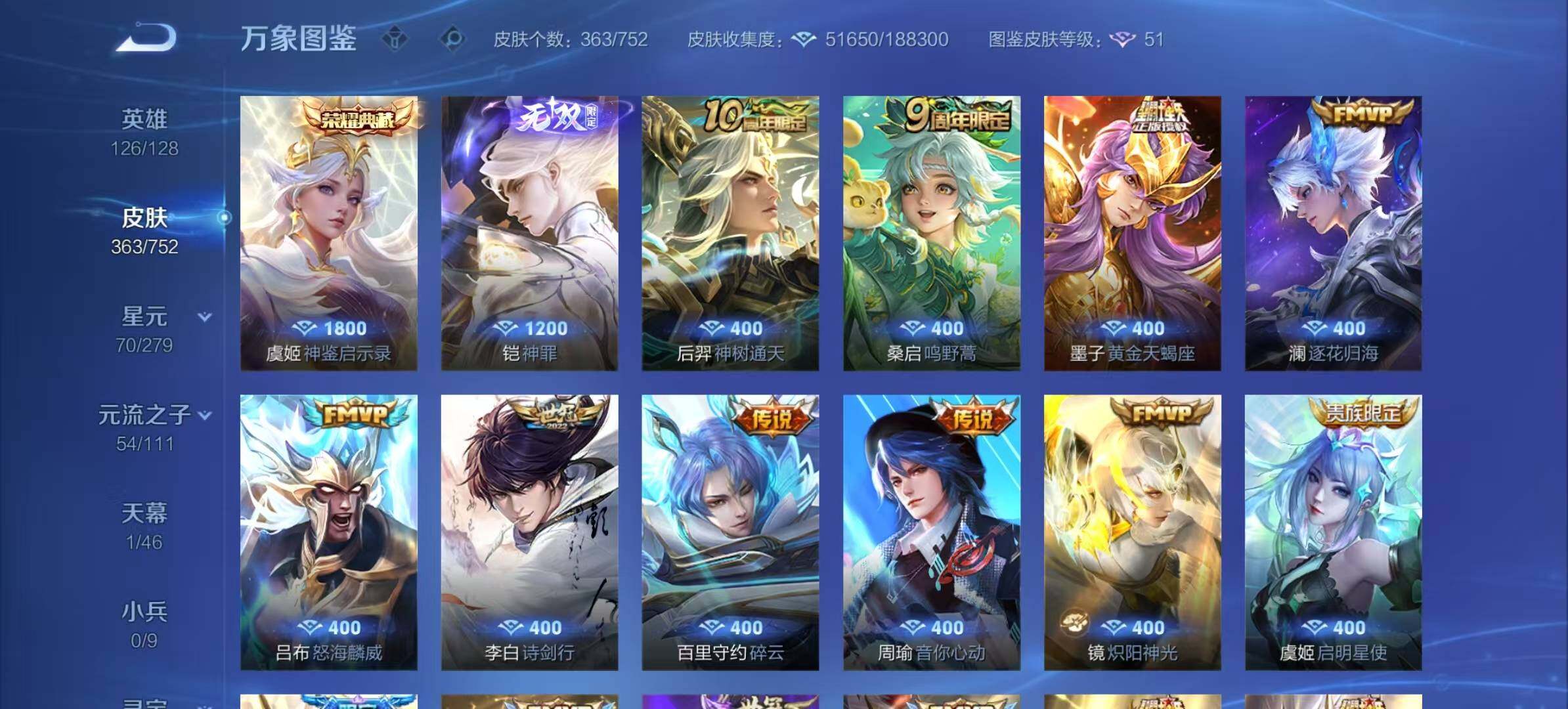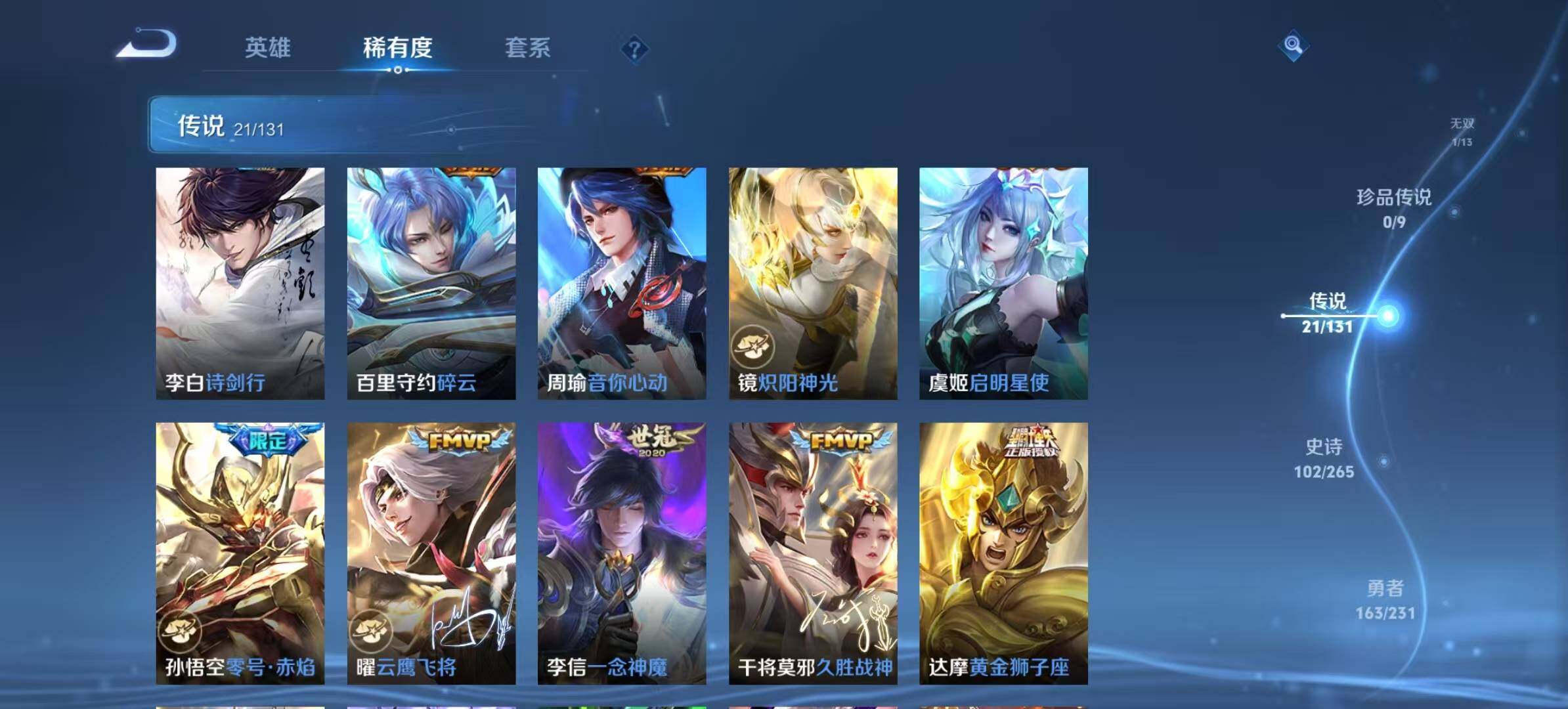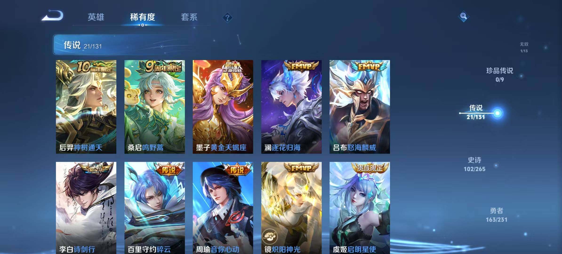 【传说皮肤】:后羿神树通天,桑启鸣野蒿,墨子黄金天蝎座,澜逐花归海,吕布怒海麟威,李白诗剑行,百里守约碎云,周瑜音你心动,镜炽阳神光,虞姬启明星使,孙悟空零号赤焰,曜云鹰飞将,李信一念神魔,干将莫邪久胜战神,达摩黄金狮子座,后羿黄金射手座,貂蝉仲夏夜之梦,孙尚香末日机甲,宫本武藏地狱之眼,孙悟空地狱火,狄仁杰超时空战士