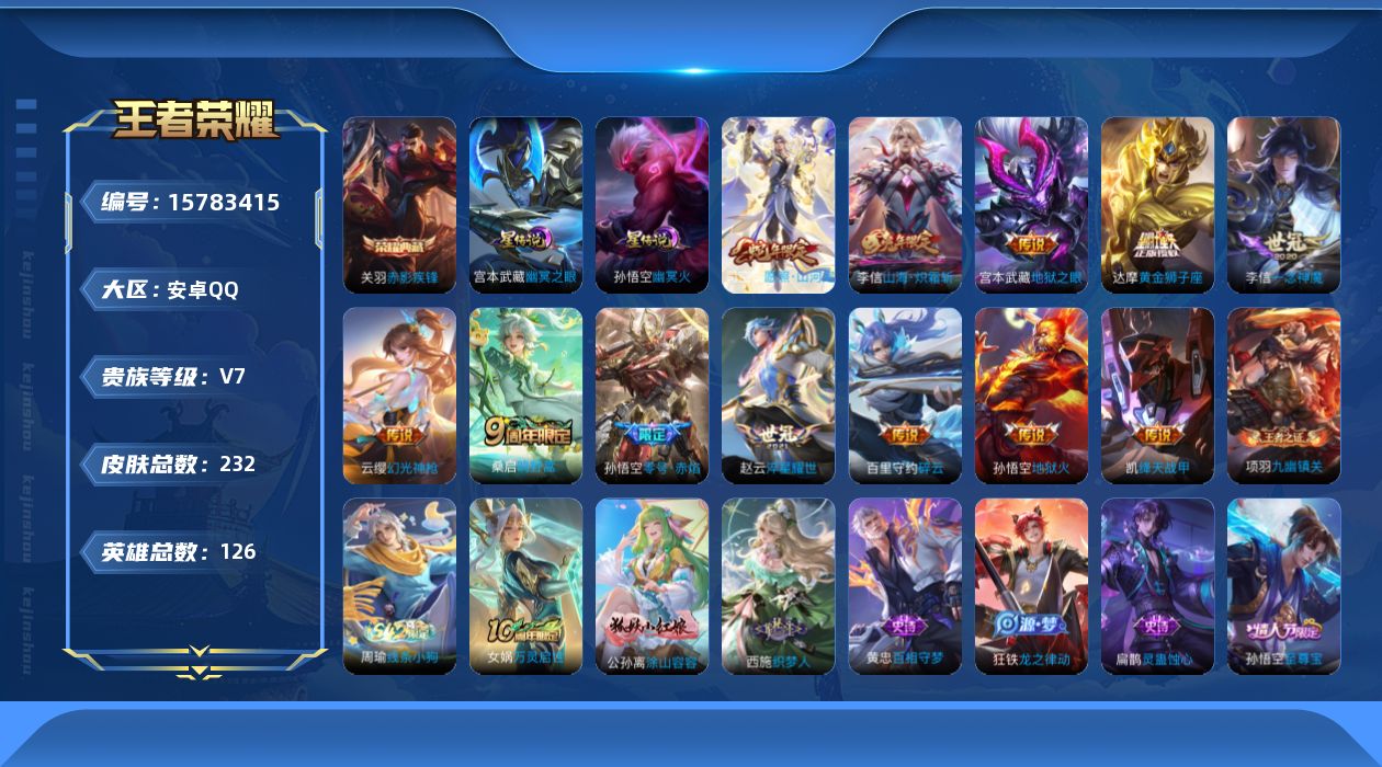 [15783415]安卓Q-V7-至尊星耀V段位-126英雄-231皮肤-1典藏皮肤-12传说-57史诗