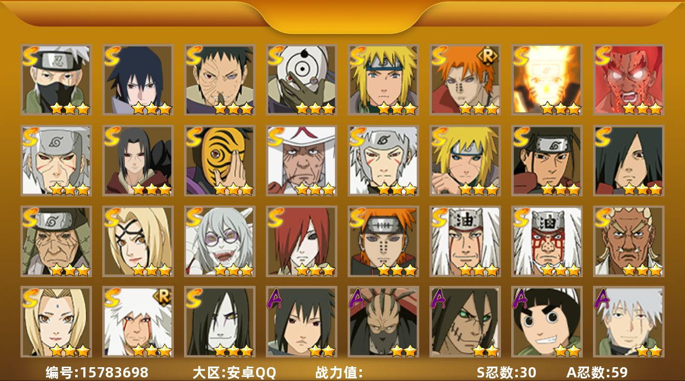【S级忍者】:长门「秽土转生」(4星),猿飞日斩「秽土转生」(3星),波风水门「秽土转生」(3星),千手扉间「秽土转生」(3星),宇智波鼬「秽土转生」(3星),宇智波带土「忍界大战」(3星),宇智波鼬「须佐能乎」(4星),旗木卡卡西「须佐能乎」(3星),艾「四代目雷影」(3星),自来也(3星),自来也「仙人模式」(3星),自来也「舞之豪杰」(3星),大蛇丸(4星),自来也「传说中的三忍」(3星),纲手(5星),纲手「百豪」(3星),千手柱间(3星),千手扉间(3星),猿飞日斩(5星),宇智波斑(3星),波风水门(4星),药师兜「仙人模式」(3星),神秘面具男(3星),漩涡鸣人「九喇嘛连结」(3星),迈特凯「死门」(3星),佩恩「天道」(4星),佩恩·天道「超」(3星),宇智波佐助「永恒万花筒」(3星),宇智波斑 「白面具」(3星宇智波斑「白面具」),波风水门「九喇嘛连结」(3星)