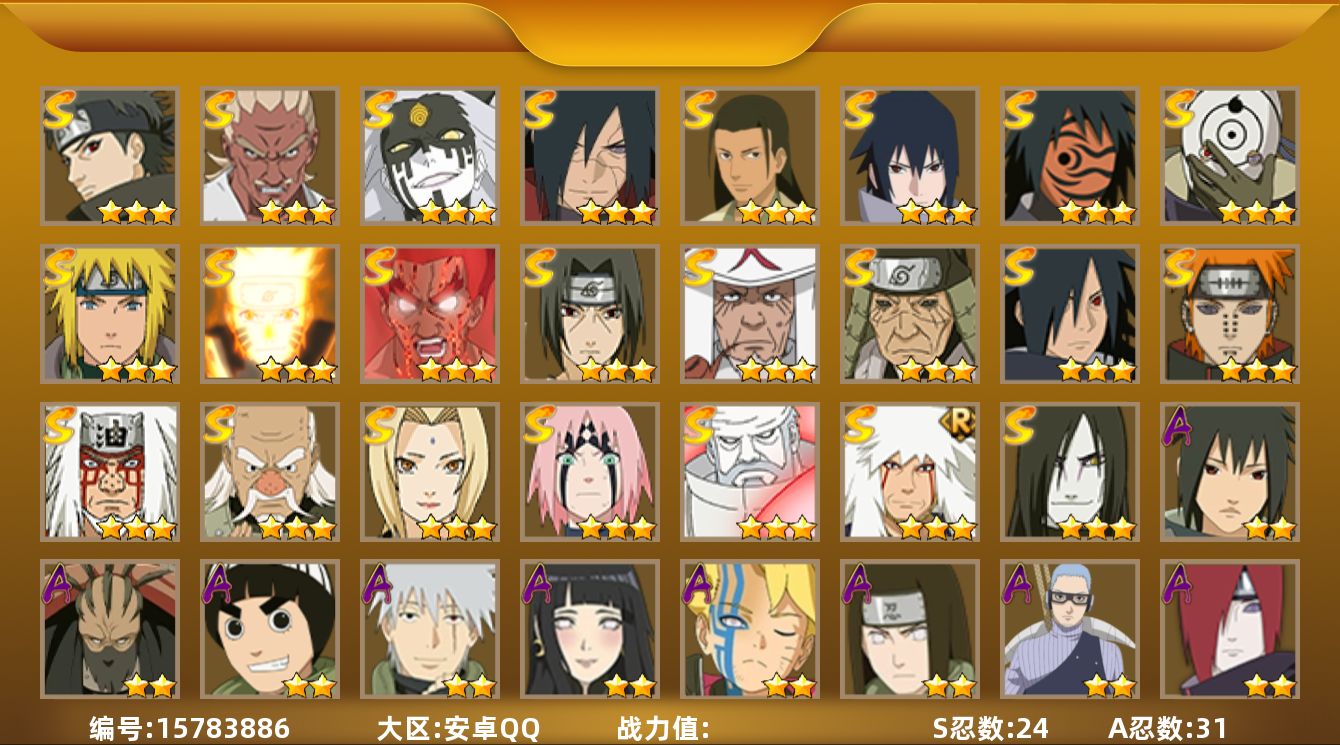 【S级忍者】:猿飞日斩「秽土转生」(3星),宇智波斑「秽土转生·解」(3星),大野木「忍界大战」(3星),春野樱「忍界大战」(3星),艾「忍界大战」(3星),宇智波鼬「须佐能乎」(3星),宇智波止水「须佐能乎」(3星),宇智波斑「木叶创立」(3星),千手柱间「木叶创立」(3星),自来也「仙人模式」(3星),自来也「舞之豪杰」(3星),大蛇丸(3星),自来也「传说中的三忍」(3星),纲手(4星),猿飞日斩(4星),波风水门(3星),神秘面具男「红夜之刃」(3星),漩涡鸣人「九喇嘛连结」(3星),迈特凯「死门」(3星),佩恩「天道」(3星),宇智波佐助「永恒万花筒」(3星),宇智波斑 「白面具」(3星宇智波斑「白面具」),大筒木金式(3星),大筒木桃式(3星)