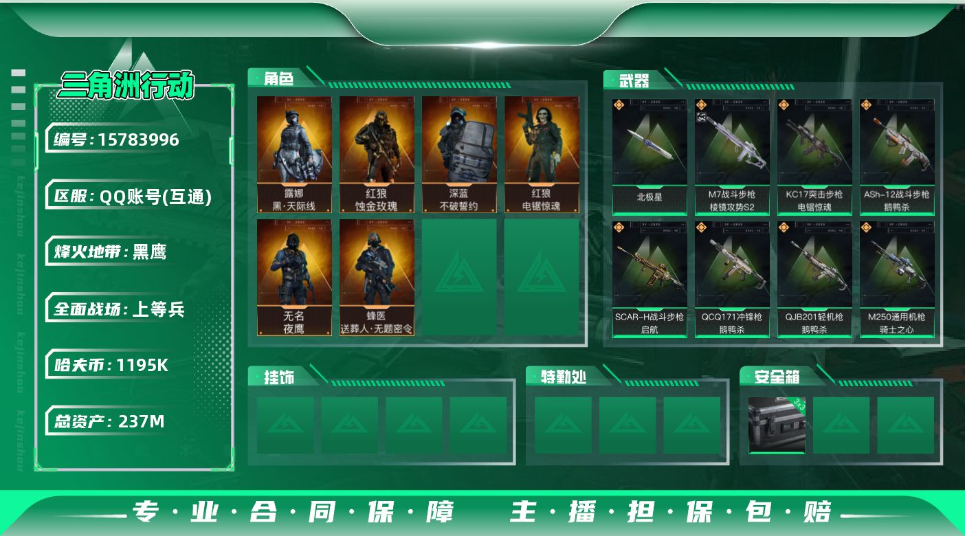 [15783996]【店主推荐捡漏号!可直接换绑】1195k哈伏币-197m流动资产-60烽火等级-黑鹰-17战场等级-上等兵 【干员外观】:红狼-蚀金玫瑰,露娜-黑·天际线,蜂医-送葬人·无题密令,无名-夜鹰,深蓝-不破誓约,红狼-电锯惊魂 【近战皮肤】:近战-北极星,近战-黑鹰 【典藏外观】:M7战斗步枪-棱镜攻势S2 【传说外观】:M4A1突击步枪-蚀金玫瑰,M4A1突击步枪-阿米娅,ASh-12战斗步枪-鹅鸭杀,AK-12突击步枪-夜鹰,AK-12突击步枪-特斯拉线圈,SCAR-H战斗步枪-启航,CAR-15突击步枪-阿米娅,腾龙突击步枪-捞点薯条,K437突击步枪-北极星,KC17突击步枪-电锯惊魂,UZI冲锋枪-特斯拉线圈,SMG-45冲锋枪-骑士,SR-3M紧凑突击步枪-特斯拉线圈,勇士冲锋枪-能天使-午夜邮差,QCQ171冲锋枪-北极星,QCQ171冲锋枪-鹅鸭杀,725双管霰弹枪-送葬人-无题密令,M250通用机枪-骑士之心,QJB201轻机枪-鹅鸭杀,AWM狙击步枪-捞点薯条,93R-捞点薯条,复合弓-黑·天际线 【史诗外观】:AUG突击步枪-天命,SR-25射手步枪-天命,AKM突击步枪-林中猎手,QBZ95-1突击步枪-曙光,ASh-12战斗步枪-守夜人,ASh-12战斗步枪-无极限,M16A4突击步枪-竞赛选手,SG552突击步枪-尖端治疗,SG552突击步枪-深海恐惧,SCAR-H战斗步枪-囚徒,AS Val突击步枪-尖端治疗,腾龙突击步枪-无垢,腾龙突击步枪-猎鳄行动,K437突击步枪-守护者,MP5冲锋枪-深海恐惧,MP5冲锋枪-战术竞备,MP5冲锋枪-竞技风,Vector冲锋枪-阿萨拉文明,SR-3M紧凑突击步枪-荒野求生,SR-3M紧凑突击步枪-战术竞备,勇士冲锋枪-工业狂潮,MP7冲锋枪-无垢,MP7冲锋枪-守护者,M1014霰弹枪-林中猎手,PKM通用机枪-守夜人,PKM通用机枪-荒野求生,Mini-14射手步枪-守护者,SVD狙击步枪-阿萨拉工艺,SVD狙击步枪-暗夜猎手,SVD狙击步枪-荒野求生,SR-25射手步枪-尖端治疗,PSG-1射手步枪-无垢,SV-98狙击步枪-林中猎手,SV-98狙击步枪-囚徒,SV-98狙击步枪-猎鳄行动,M700狙击步枪-蝮蛇,M700狙击步枪-守夜人,AWM狙击步枪-无极限,复合弓-守护者 【稀有外观】:M