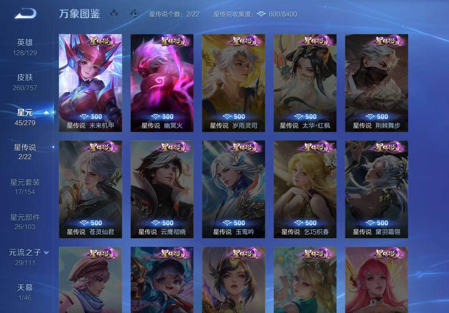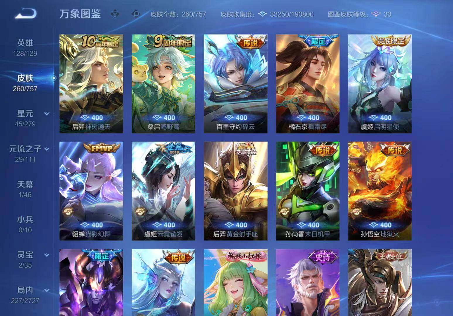 孙膑妖精王,扁鹊炼金王,虞姬凯尔特女王,白起狰,太乙真人饕餮,曹操烛龙,芈月重明,典韦穷奇,狂铁御狮,米莱狄御霄,牛魔御旌,盾山御銮,夏侯惇朔风刀,明世隐疑决卦,老夫子醍醐杖,鬼谷子原初探秘者,狄仁杰万华元夜,程咬金演武夺筹,钟馗驱傩正仪,苏烈千军破阵,吕布猎兽之王,嬴政白昼王子,女娲朔望之晖,典韦蓝屏警告,钟馗神迹守卫,鲁班七号狮舞东方,沈梦溪星空之诺,李元芳银河之约,刘邦夺宝奇兵,马可波罗暗影游猎,蒙犽狂想玩偶喵,弈星混沌棋,达摩沙漠行僧,兰陵王金庭之子,沈梦溪大漠名商,李元芳云中旅人,桑启海盐诗旅,裴擒虎擒涛扼浪,鲁班大师探海日志,张良古海寻踪