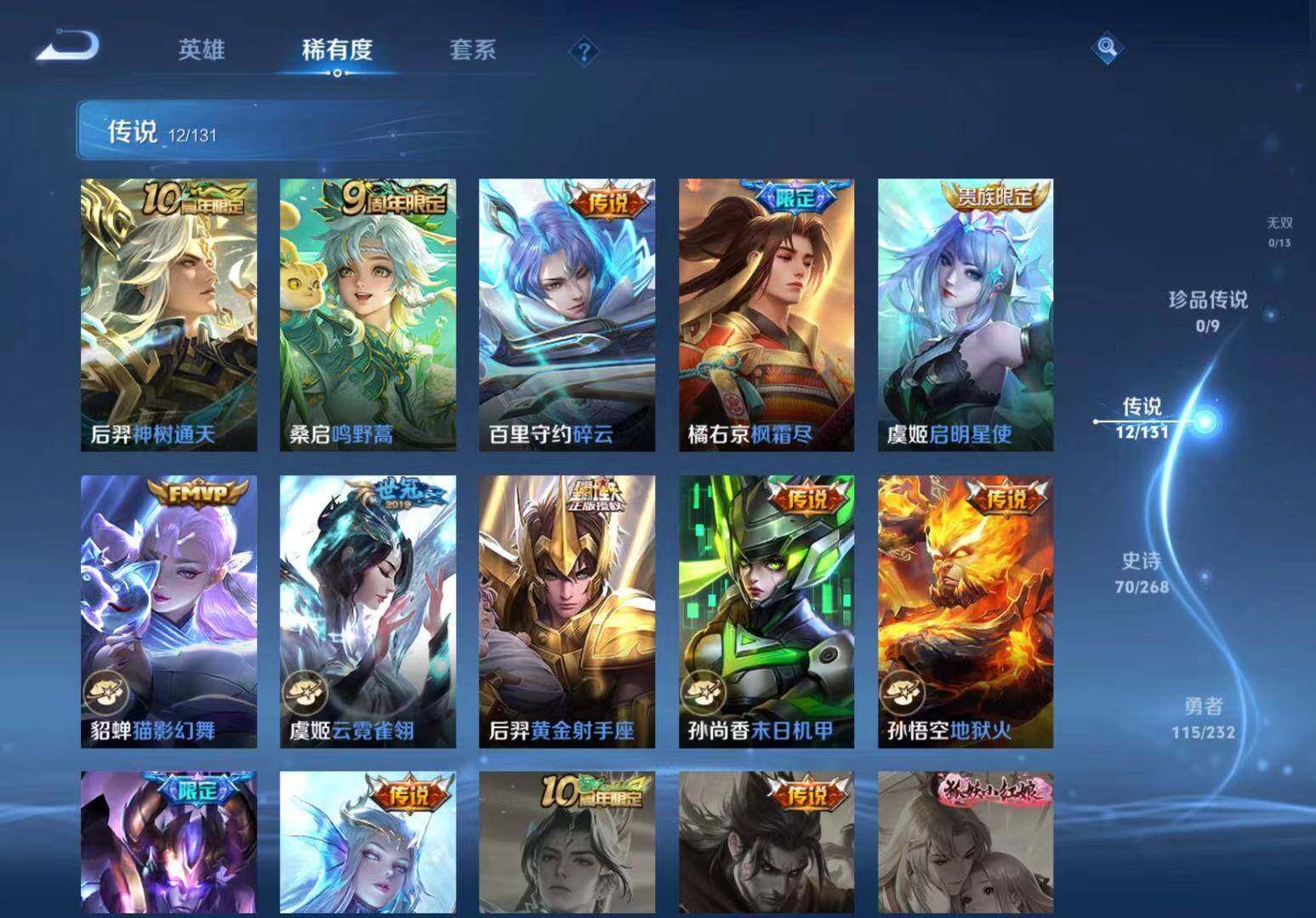 【传说皮肤】:后羿神树通天,桑启鸣野蒿,百里守约碎云,橘右京枫霜尽,虞姬启明星使,貂蝉猫影幻舞,虞姬云霓雀翎,后羿黄金射手座,孙尚香末日机甲,孙悟空地狱火,吕布天魔缭乱,武则天海洋之心