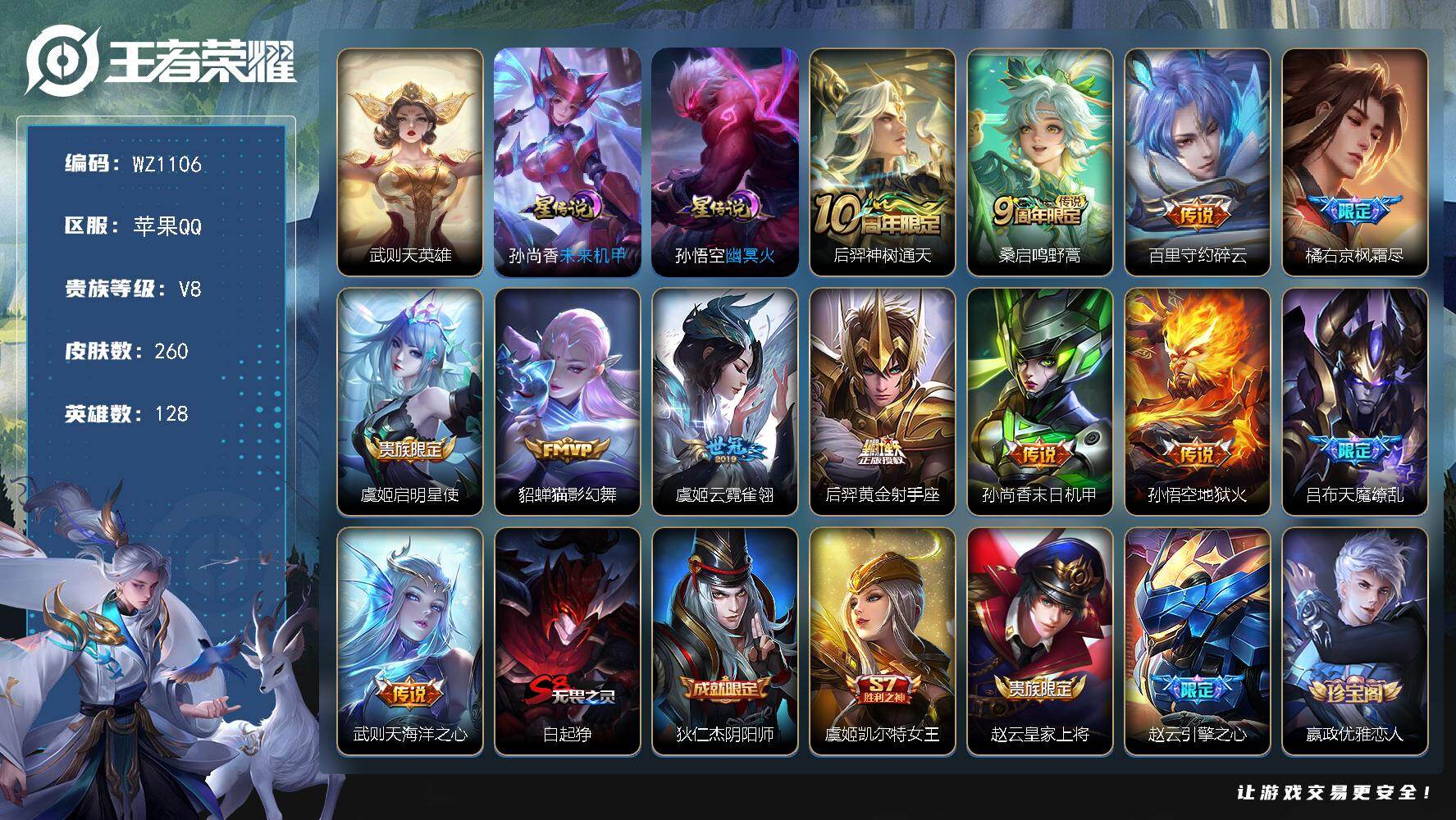 [15784261]苹果Q-V8-260皮肤-1典藏英雄-12传说-70史诗 【英雄全皮】:孙权全皮 【荣耀典藏】:武则天英雄 【传说皮肤】:后羿神树通天,桑启鸣野蒿,百里守约碎云,橘右京枫霜尽,虞姬启明星使,貂蝉猫影幻舞,虞姬云霓雀翎,后羿黄金射手座,孙尚香末日机甲,孙悟空地狱火,吕布天魔缭乱,武则天海洋之心 【限定皮肤】:白起狰,狄仁杰阴阳师,虞姬凯尔特女王,赵云皇家上将,赵云引擎之心,嬴政优雅恋人,嬴政白昼王子,孙尚香蔷薇恋人,鲁班七号狮舞东方,庄周高山流水,高渐离死亡摇滚,阿轲迷踪丽影,钟无艳超时空战士,孙膑妖精王,扁鹊炼金王,芈月重明,吕布天魔缭乱,吕布猎兽之王,周瑜赤莲之焰,元歌无心,夏侯惇朔风刀,甄姬游园惊梦,甄姬落雪兰心,曹操烛龙,曹操天狼征服者,典韦穷奇,典韦蓝屏警告,马可波罗暗影游猎,狄仁杰魔术师,狄仁杰万华元夜,达摩沙漠行僧,项羽海滩派对,老夫子醍醐杖,关羽冰锋战神,程咬金演武夺筹,露娜一生所爱,刘邦夺宝奇兵,韩信飞衡,兰陵王驯魔猎人,兰陵王金庭之子,橘右京枫霜尽,孙悟空大圣娶亲,牛魔御旌,后羿辉光之辰,后羿圣弓游侠,李元芳银河之约,李元芳云中旅人,虞姬启明星使,钟馗神迹守卫,钟馗驱傩正仪,杨玉环遇见飞天,女娲朔望之晖,干将莫邪冰霜恋舞曲,干将莫邪真爱魔法,雅典娜单词大作战,雅典娜黎明之约,蔡文姬繁星吟游,太乙真人饕餮,太乙真人华丽摇滚,鬼谷子原初探秘者,苏烈千军破阵,百里玄策原初追逐者,弈星混沌棋,沈梦溪星空之诺,沈梦溪大漠名商,明世隐疑决卦,裴擒虎天狼狩猎者,裴擒虎李小龙,裴擒虎擒涛扼浪,狂铁御狮,米莱狄御霄,云中君纤云弄巧,盾山御銮,猪八戒西部大镖客,上官婉儿梁祝,嫦娥拒霜思,西施玲珑珍味,蒙犽狂想玩偶喵,鲁班大师探海日志,桑启海盐诗旅,艾琳女武神,张良古海寻踪,蒙恬荣光圣徽,鬼谷子天穹祈灯,沈梦溪龙舞盛年,刘邦剑破天穹 【年限皮肤】:后羿辉光之辰,韩信飞衡 【赛季限定】:孙膑妖精王,扁鹊炼金王,白起狰,芈月重明,夏侯惇朔风刀,曹操烛龙,典韦穷奇,狄仁杰万华元夜,达摩沙漠行僧,老夫子醍醐杖,程咬金演武夺筹,兰陵王金庭之子,张良古海寻踪,牛魔御旌,李元芳云中旅人,虞姬凯尔特女王,钟馗驱傩正仪,雅典娜黎明之约,太乙真人饕餮,鬼谷子原初探秘者,苏烈千军破阵,百里玄策原初追逐者,弈星混沌棋,沈梦溪大漠名商,明世隐疑决卦,裴擒虎擒涛扼浪,狂铁御狮,米莱狄御霄,盾山御