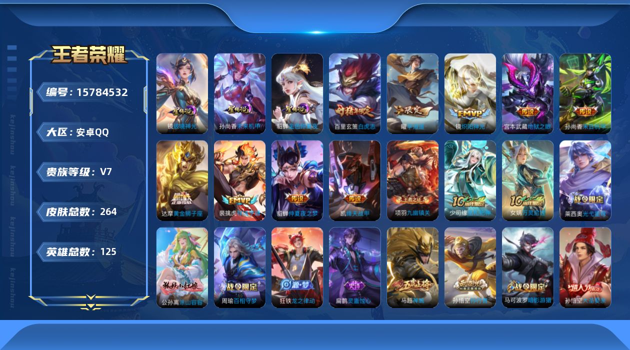 [15784532]金标玄策 按键2 ,安卓Q-V7-263皮肤-10传说-70史诗 【英雄全皮】:孙权全皮,猪八戒全皮,蒙恬全皮,影全皮 【传说皮肤】:后羿神树通天,裴擒虎祥瑞亨通,曜李逍遥 ,铠绛天战甲,镜炽阳神光,达摩黄金狮子座,百里玄策白虎志,貂蝉仲夏夜之梦,孙尚香末日机甲,宫本武藏地狱之眼 【限定皮肤】:白起狰,蔡文姬夏日便利店,姜子牙天穹之誓,狄仁杰阴阳师,赵云皇家上将,鲁班七号乒乒小将,庄周高山流水,高渐离玩趣恶龙,元歌云间偶戏,夏侯惇朔风刀,马可波罗暗影游猎,狄仁杰魔术师,狄仁杰万华元夜,达摩沙漠行僧,项羽海滩派对,老夫子醍醐杖,程咬金演武夺筹,韩信逐梦之影,韩信飞衡,兰陵王金庭之子,亚瑟潮玩骑士王,孙悟空大圣娶亲,孙悟空孙行者,牛魔御旌,李元芳云中旅人,虞姬霸王别姬,钟馗神迹守卫,钟馗驱傩正仪,雅典娜单词大作战,雅典娜黎明之约,蔡文姬繁星吟游,太乙真人华丽摇滚,鬼谷子原初探秘者,鬼谷子五谷丰年,苏烈千军破阵,百里玄策白虎志,百里玄策原初追逐者,百里守约朱雀志,弈星混沌棋,梦奇顽趣,沈梦溪大漠名商,明世隐疑决卦,裴擒虎李小龙,裴擒虎擒涛扼浪,狂铁御狮,米莱狄御霄,云中君纤云弄巧,盾山御銮,猪八戒西部大镖客,猪八戒猪悟能,上官婉儿梁祝,嫦娥拒霜思,嫦娥暖冬兔眠,曜李逍遥 ,蒙犽狂想玩偶喵,鲁班大师探海日志,镜匿光追影者,桑启海盐诗旅,暃星界游侠,艾琳女武神,张良古海寻踪,蒙恬荣光圣徽,鬼谷子天穹祈灯,姬小满妄想食味,沈梦溪龙舞盛年,刘邦剑破天穹,程咬金群星魔术团 【年限皮肤】:百里玄策白虎志,百里守约朱雀志,韩信飞衡,马超神威 【赛季限定】:白起狰,夏侯惇朔风刀,狄仁杰万华元夜,达摩沙漠行僧,老夫子醍醐杖,程咬金演武夺筹,兰陵王金庭之子,张良古海寻踪,牛魔御旌,李元芳云中旅人,钟馗驱傩正仪,雅典娜黎明之约,鬼谷子原初探秘者,苏烈千军破阵,百里玄策原初追逐者,弈星混沌棋,梦奇顽趣,沈梦溪大漠名商,明世隐疑决卦,裴擒虎擒涛扼浪,狂铁御狮,米莱狄御霄,盾山御銮,鲁班大师探海日志,桑启海盐诗旅,鬼谷子天穹祈灯,蒙恬荣光圣徽,刘邦剑破天穹,姜子牙天穹之誓 【战令限定】:蔡文姬夏日便利店,元歌云间偶戏,马可波罗暗影游猎,亚瑟潮玩骑士王,钟馗神迹守卫,雅典娜单词大作战,猪八戒西部大镖客,嫦娥暖冬兔眠,蒙犽狂想玩偶喵,暃星界游侠 【史诗皮肤】:项羽苍穹之光,赵云皇家上将,貂蝉圣诞恋歌,