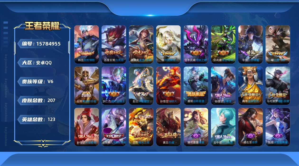 - PX_2095237-安卓QQ-有二次-贵4-123英雄-176皮肤-5传说-46限定-4按键-灵宝-6印记-3678贵族积分-营地1759293783-热门皮肤-澜愿照·九州拓,云缨幻光神枪,孙悟空齐天大圣,后羿黄金射手座,孙尚香时之恋人,百里守约特工魅影,墨子龙骑士,妲己女仆咖啡,甄姬冰雪圆舞曲,赵云未来纪元,露哪紫霞仙子