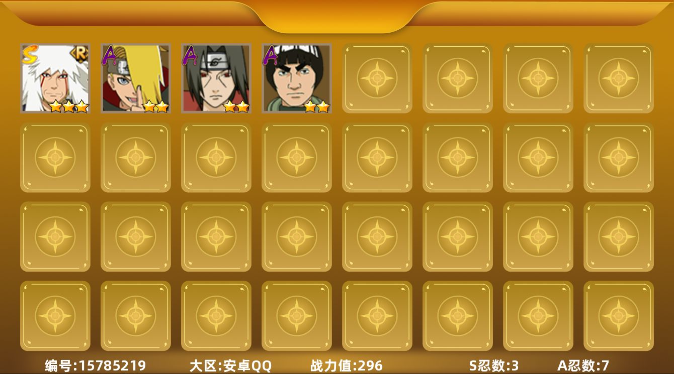 [15785219]3S级忍者数-7A级忍者数 【S级忍者】:自来也「舞之豪杰」(3星),宇智波斑「五影会谈」(3星),漩涡鸣人·宇智波佐助(3星) 【A级忍者】:迪达拉(2星),机械鸣人「初始形态」(2星),迈特凯(2星),宇智波鼬(2星),土台「忍界大战」(2星),纲手「妖怪奇谭」(2星),迈特凯「青春爆炸」(2星)