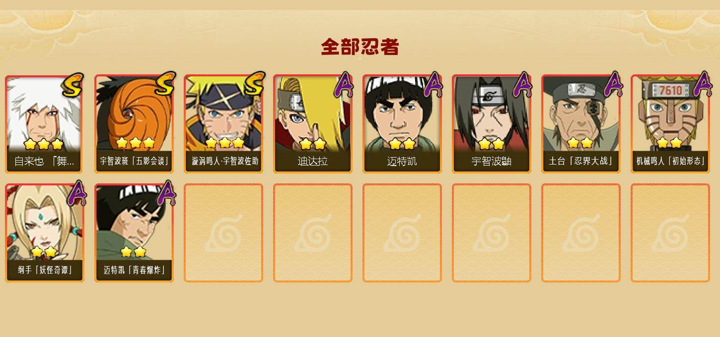 【A级忍者】:迪达拉(2星),机械鸣人「初始形态」(2星),迈特凯(2星),宇智波鼬(2星),土台「忍界大战」(2星),纲手「妖怪奇谭」(2星),迈特凯「青春爆炸」(2星)