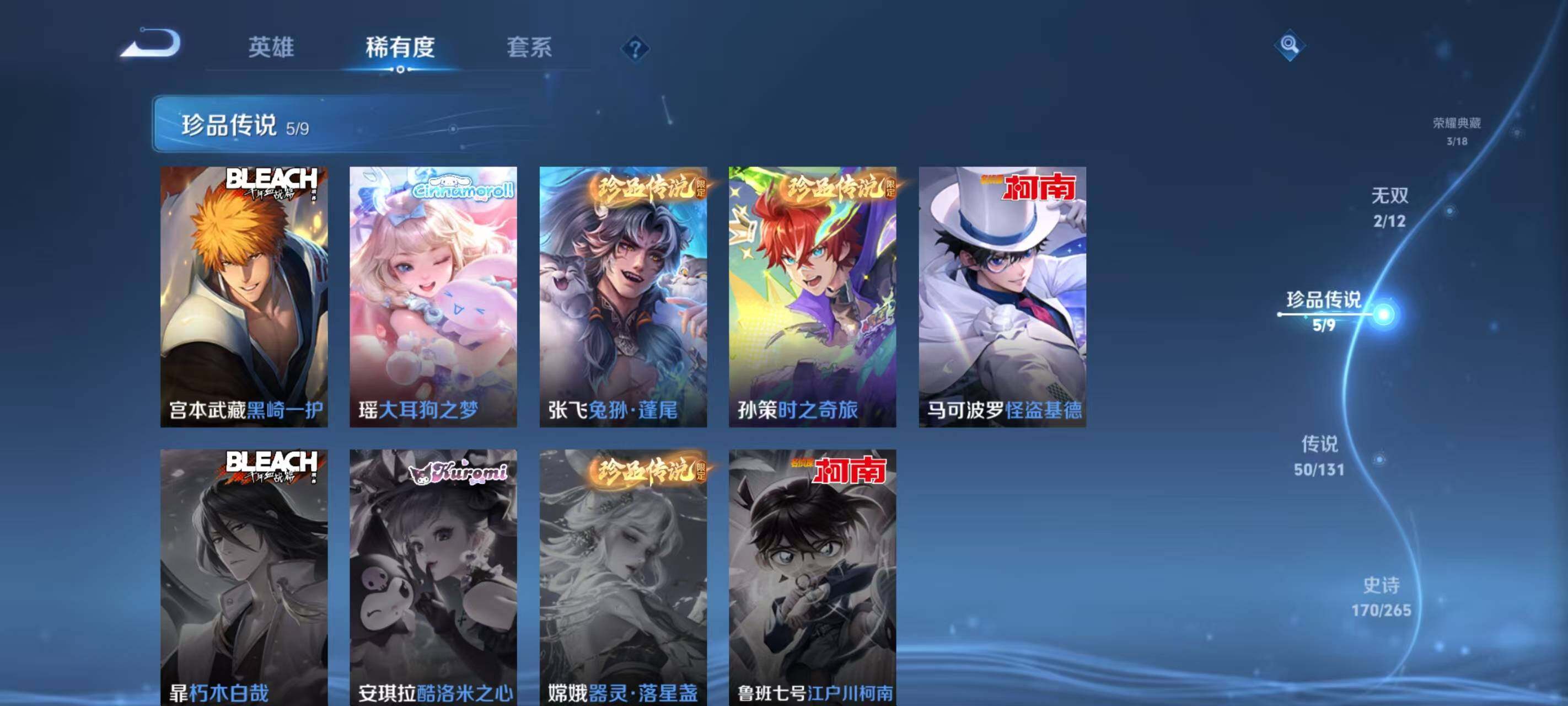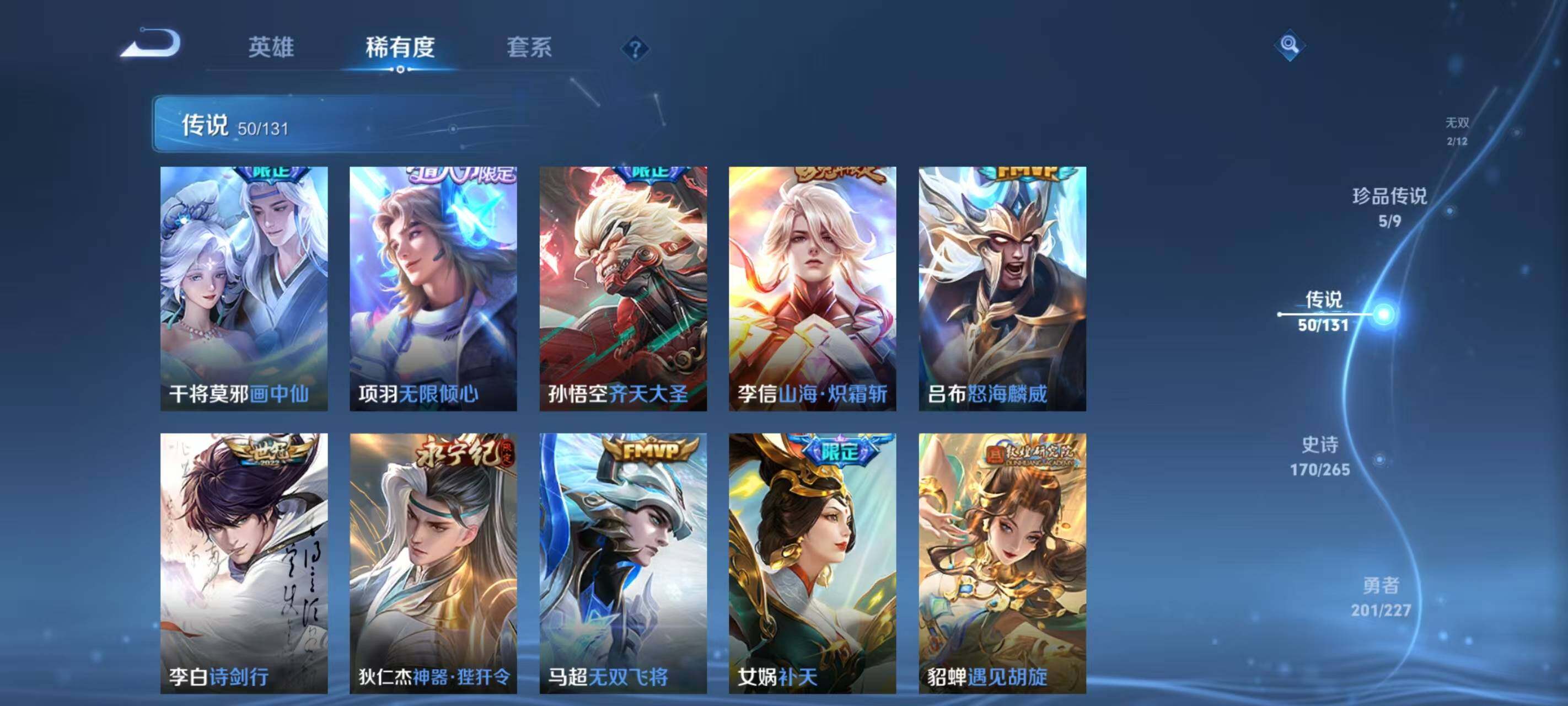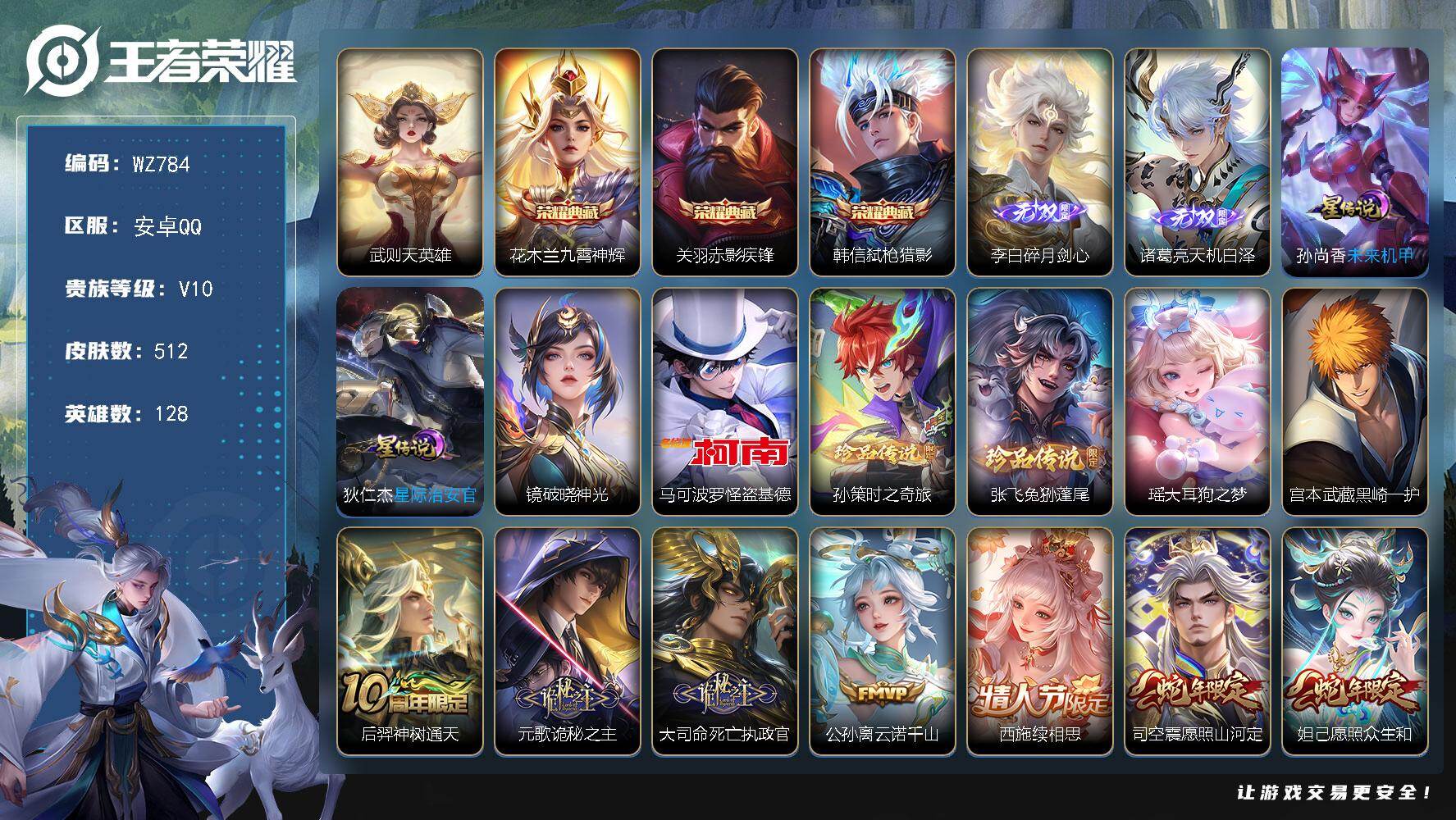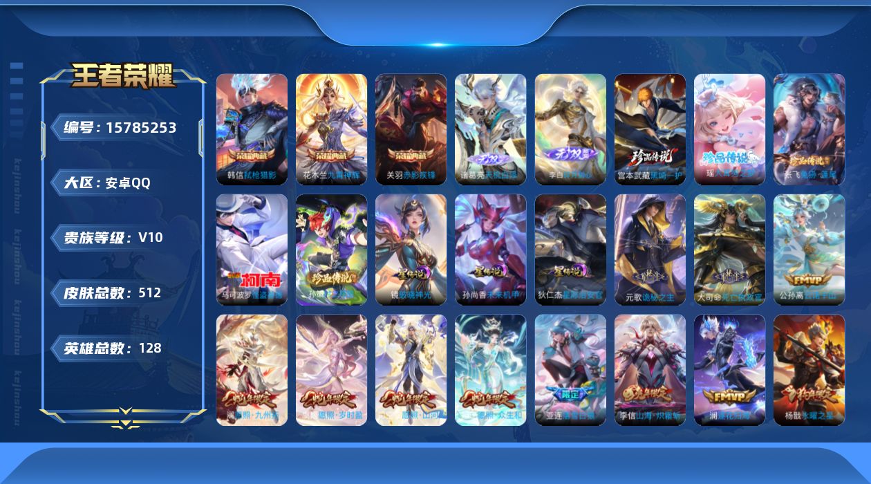 [15785253]安卓Q-V10-最强王者段位-512皮肤-3典藏皮肤-1典藏英雄-2无双-5珍品传说-50传说-170史诗