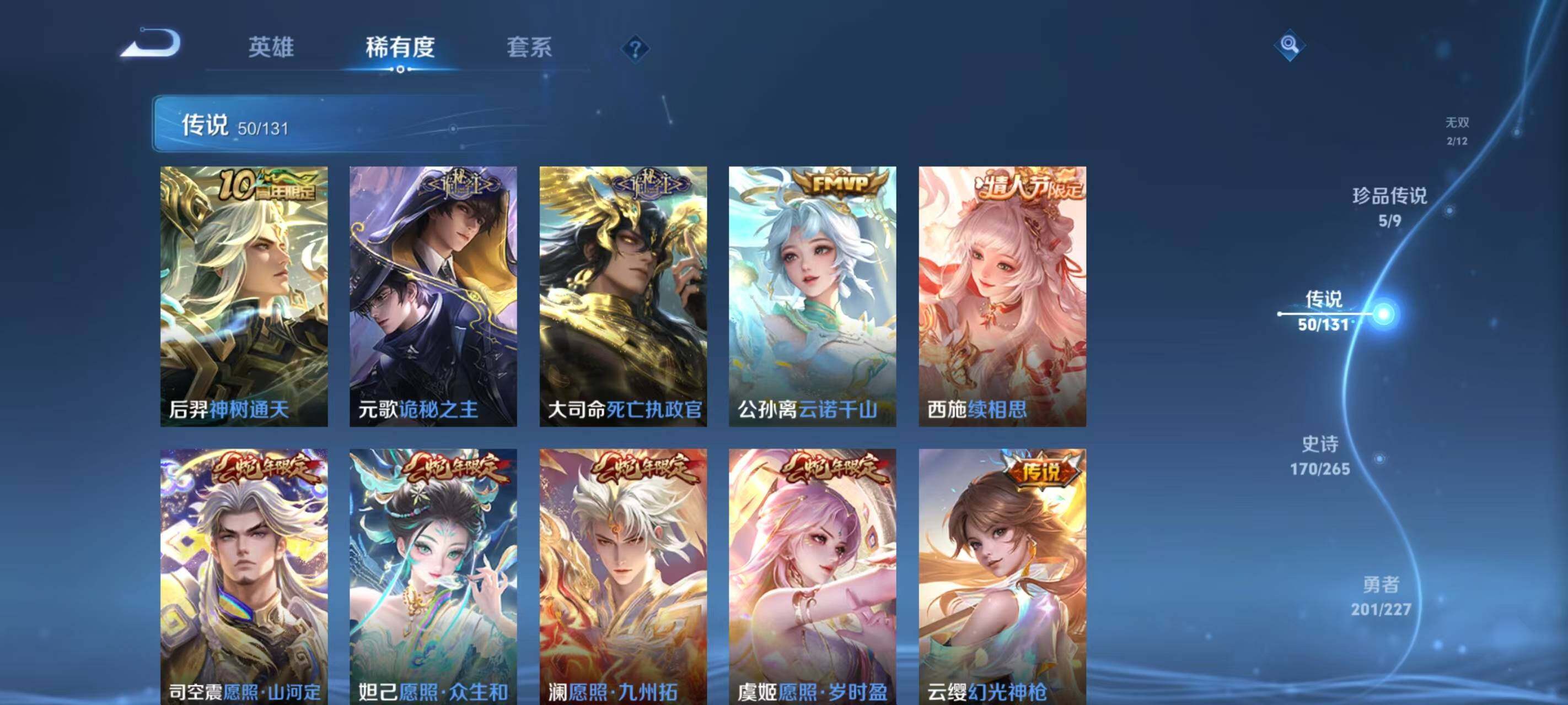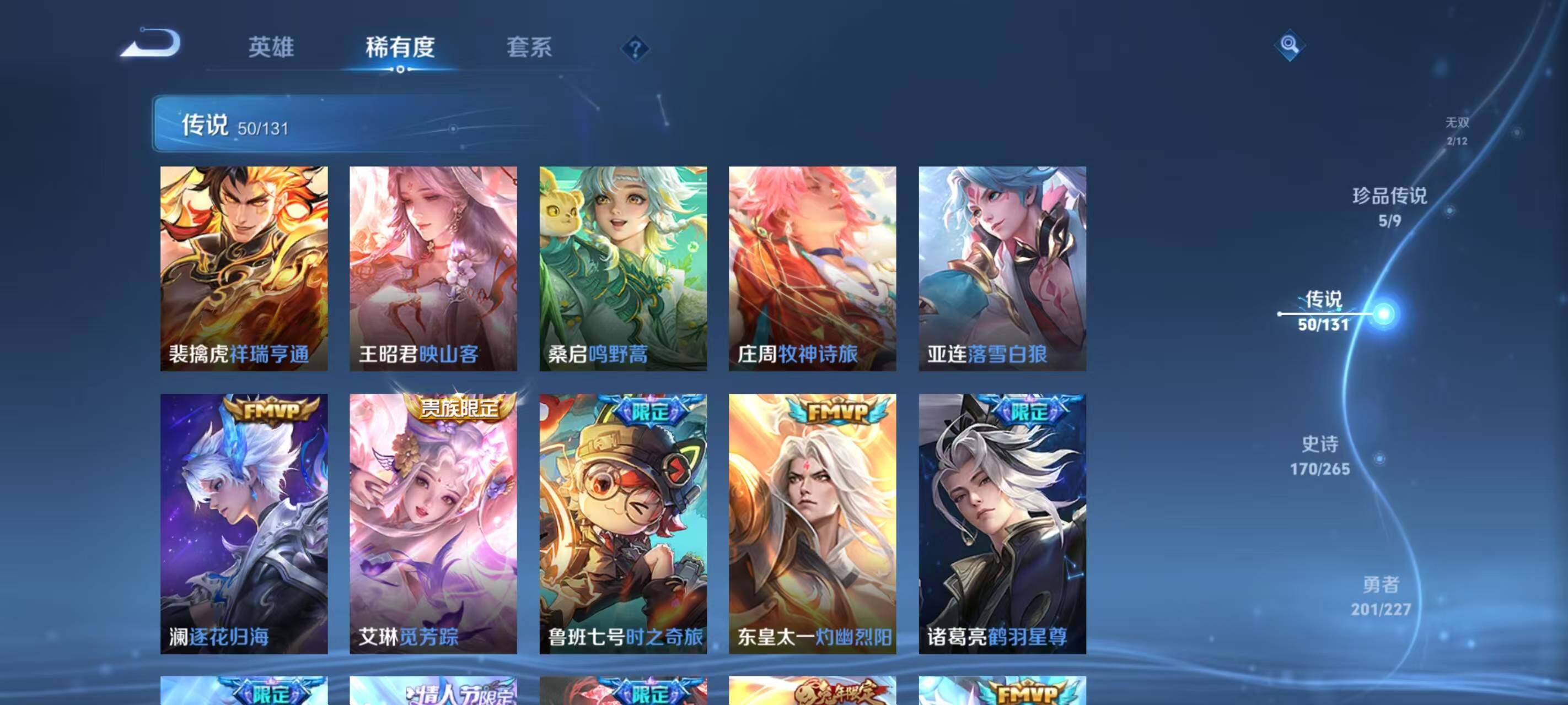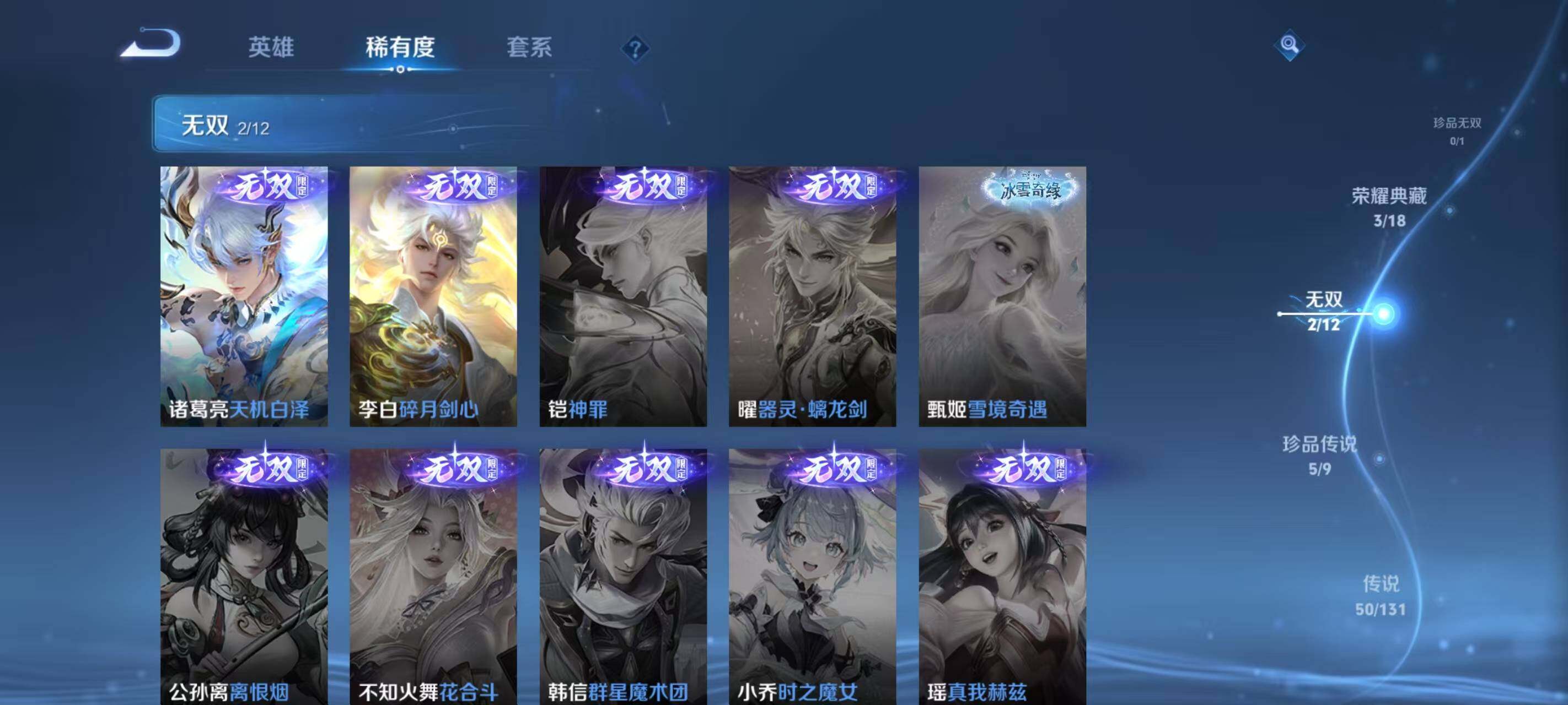 [15785253]安卓Q-V10-最强王者段位-512皮肤-3典藏皮肤-1典藏英雄-2无双-5珍品传说-50传说-170史诗