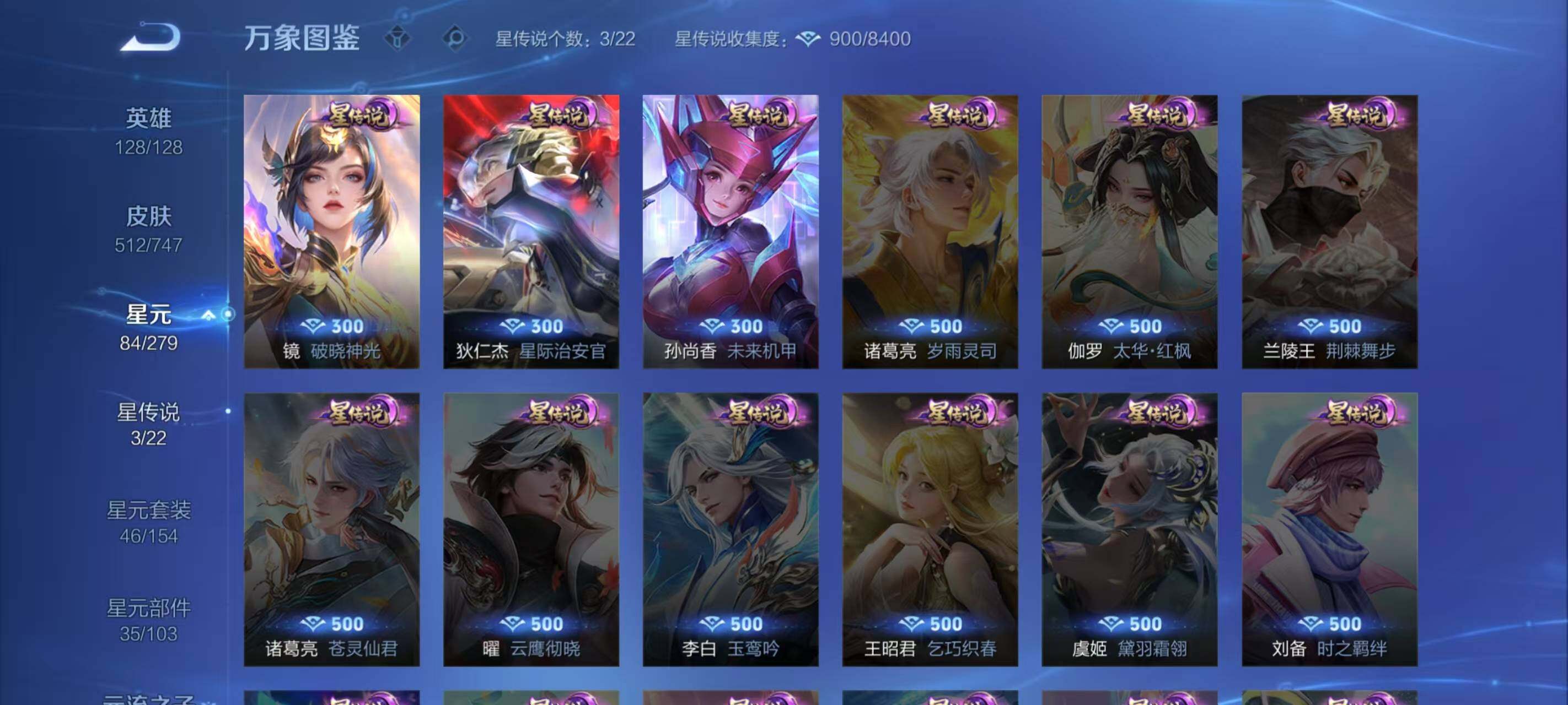 小乔青蛇,大乔白蛇,瑶遇见神鹿,娜可露露晚萤,伽罗箭羽风息,李元芳逐浪之夏,不知火舞魅语,公孙离无限星赏官,大乔猫狗日记,孙策猫狗日记,阿轲节奏热浪,露娜紫霞仙子,诸葛亮黄金分割率,王昭君偶像歌手,韩信白龙吟,项羽苍穹之光,孙尚香时之恋人,阿轲暗夜猫娘,雅典娜冰冠公主,吕布末日机甲,鲁班七号电玩小子,蒙犽龙鼓争鸣,橘右京修罗,墨子龙骑士,嬴政摇滚巨星,刘禅绅士熊喵,刘禅天才门将,白起星夜王子,安琪拉心灵骇客,安琪拉时之奇旅,程咬金功夫厨神,刘邦德古拉伯爵,兰陵王暗隐猎兽者,曹操幽灵船长,宫本武藏鬼剑武藏,司马懿暗渊魔法,亚瑟心灵战警,钟馗乐园奇幻夜,杨戬天秀·启明,蔡文姬舞动绿茵,廉颇地狱岩魂,西施诗语江南,小乔缤纷独角兽,夏侯惇乘风破浪,花木兰水晶猎龙者,铠曙光守护者,百里玄策热力回旋,墨子金属风暴,百里玄策原初追逐者,吕布圣诞狂欢,貂蝉圣诞恋歌,百里守约特工魅影,嬴政暗夜贵公子,嫦娥拒霜思,雅典娜黎明之约,李白千年之狐,哪吒雪上飞焰,夏洛特永昼,澜赏金猎手,艾琳奇遇舞章,貂蝉唤灵魅影,高渐离天秀·音浪,张良千筹问战,庄周天秀·幻梦,弈星滕王阁序,阿古朵顽趣,镜玫瑰异探,杨玉环银翎春语,沈梦溪匿光破解者,蔡文姬电玩·兔顽号,刘禅电玩·爆裂旋风,镜真我赫兹,百里守约真我赫兹,赵怀真鹤归松栖,莱西奥末日机甲,李元芳匿光侦查者,姜子牙闲日渔趣,蒙犽百解令,周瑜雪夜绮愿,高渐离燃音魔法,伽罗琥珀纪元,李白谪仙醉月,白起苍鳞隐世,赵怀真器灵·浮梦炉,苍狼魂孤将