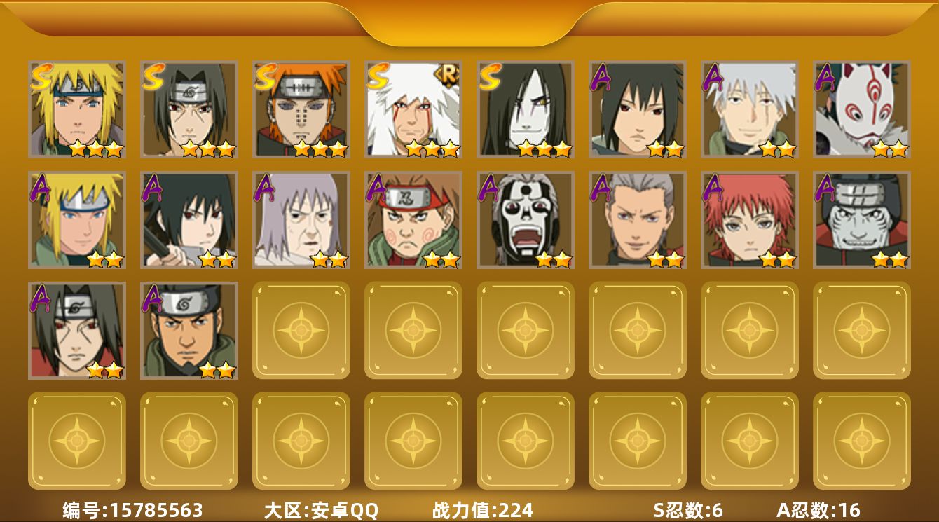 【S级忍者】:宇智波鼬「须佐能乎」(3星),自来也「舞之豪杰」(3星),大蛇丸(3星),自来也「传说中的三忍」(3星),波风水门(3星),佩恩「天道」(3星)