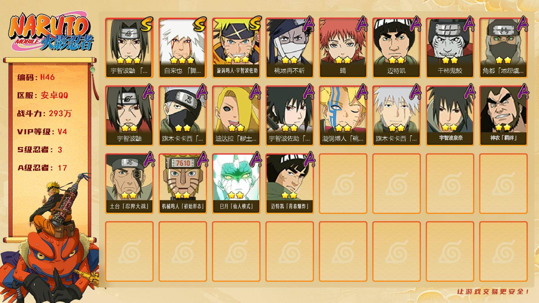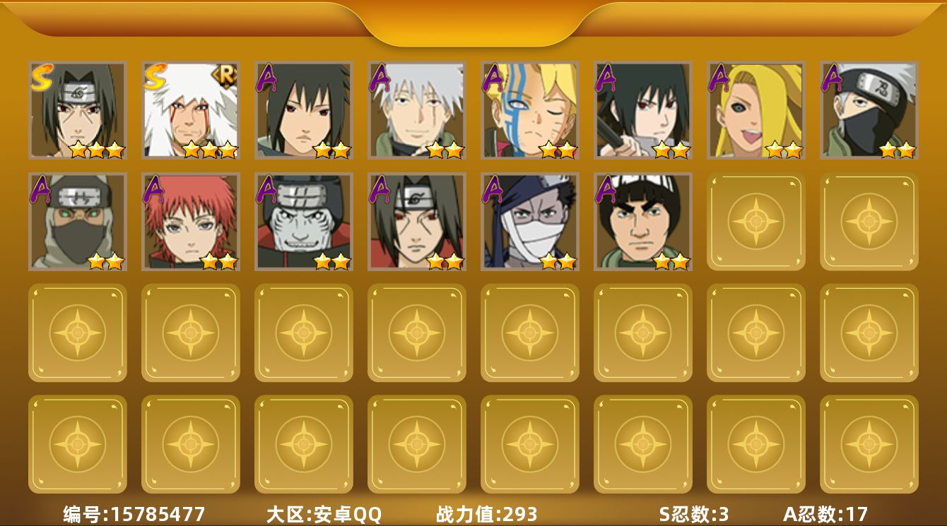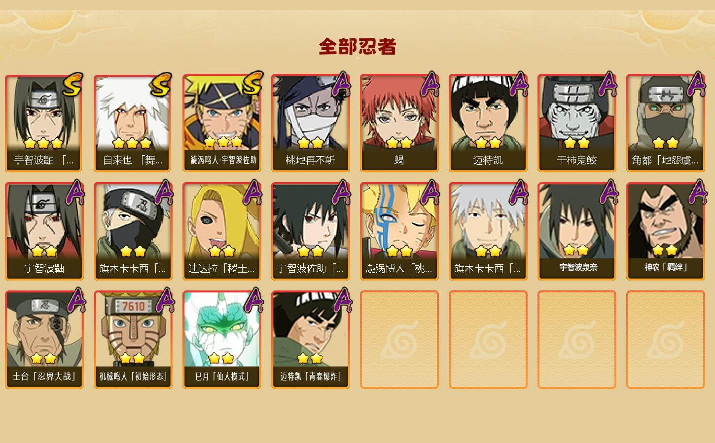 【S级忍者】:宇智波鼬「须佐能乎」(3星),自来也「舞之豪杰」(3星),漩涡鸣人·宇智波佐助(3星)