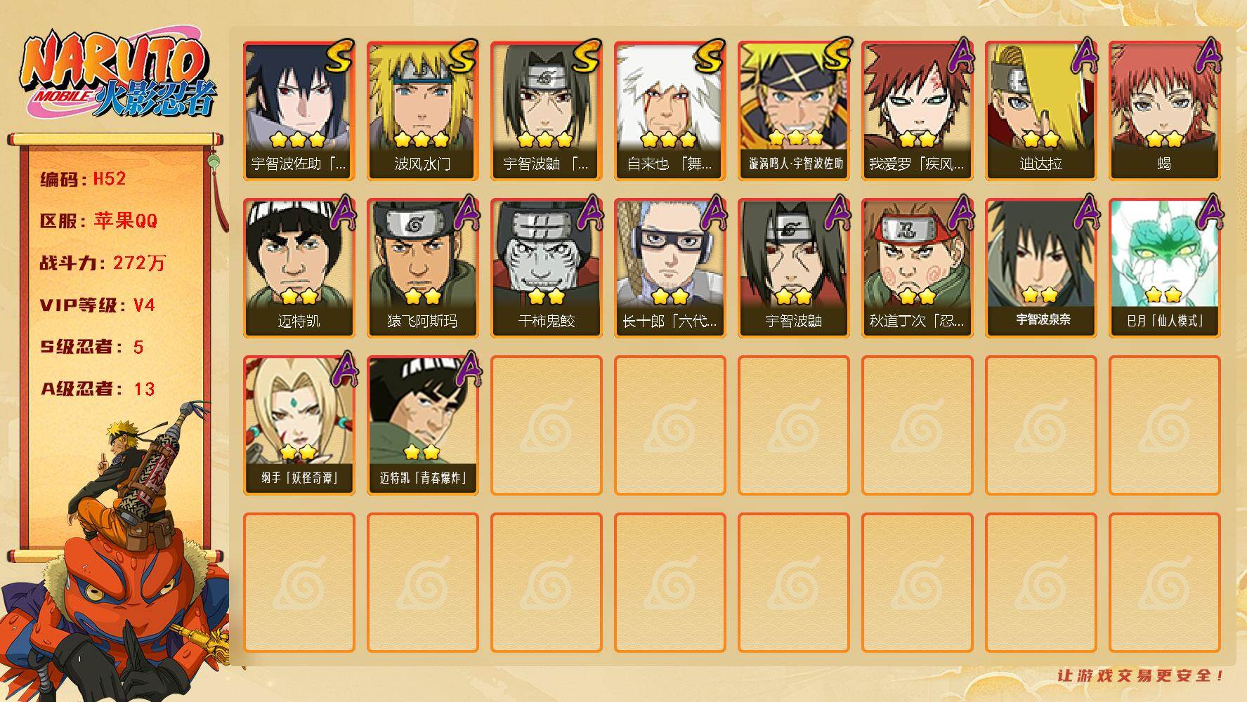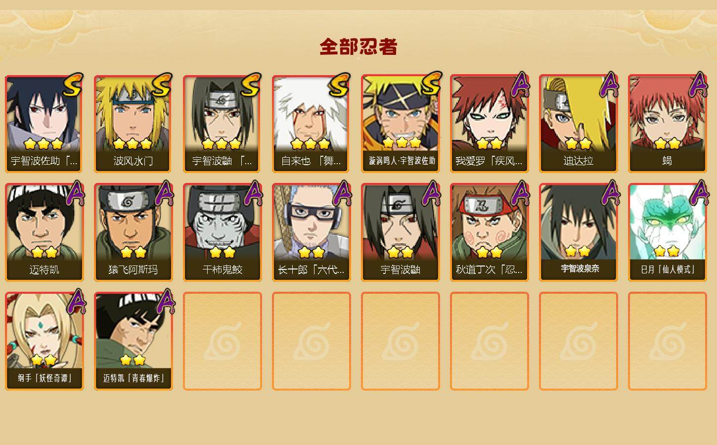 【S级忍者】:宇智波鼬「须佐能乎」(3星),自来也「舞之豪杰」(3星),波风水门(3星),宇智波佐助「永恒万花筒」(3星),漩涡鸣人·宇智波佐助(3星)