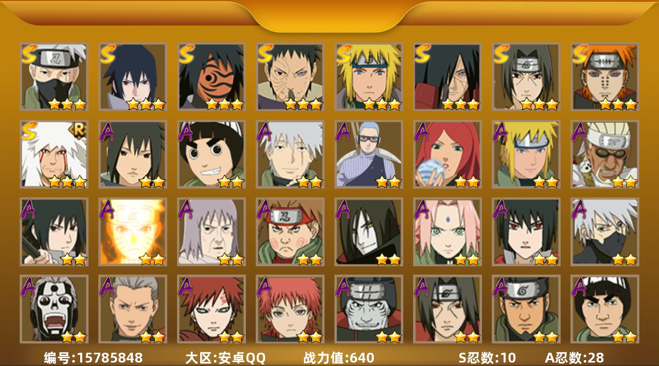 [15785848]10S级忍者数-28A级忍者数 【S级忍者】:宇智波斑「秽土转生」(3星),宇智波带土「忍界大战」(3星),宇智波鼬「须佐能乎」(3星),旗木卡卡西「须佐能乎」(3星),自来也「舞之豪杰」(3星),波风水门(3星),神秘面具男「红夜之刃」(3星),佩恩「天道」(3星),宇智波佐助「永恒万花筒」(3星),漩涡鸣人·宇智波佐助(3星) 【A级忍者】:波风水门「青年」(2星),大蛇丸「晓」(2星),奇拉比「忍界大战」(2星),飞段(3星),飞段「死司凭血」(2星),干柿鬼鲛(3星),漩涡鸣人「九尾查克拉」(2星),迈特凯(3星),旗木卡卡西「万花筒写轮眼」(2星),旗木卡卡西「幻之真容」(2星),我爱罗「疾风传」(3星),蝎(2星),猿飞阿斯玛(3星),宇智波鼬(2星),宇智波佐助「须佐能乎」(2星),宇智波佐助「万花筒写轮眼」(2星),长十郎「六代目水影」(2星),李洛克「忍界大战」(2星),黑土「博人传」(2星),春野樱「百豪」(2星),秋道丁次「忍界大战」(2星),千代「近松十人卫」(2星),不风(2星),宇智波泉奈(2星),大野木「侠隐江湖」(2星),巳月「仙人模式」(2星),纲手「妖怪奇谭」(2星),迈特凯「青春爆炸」(2星)