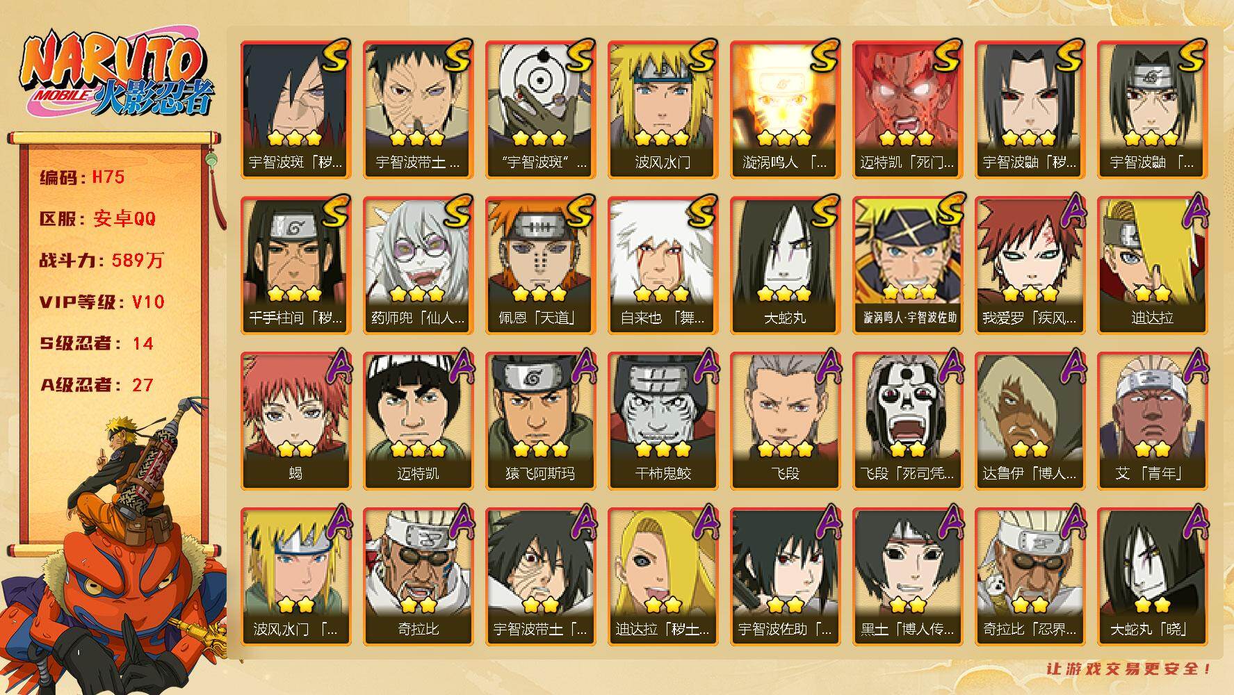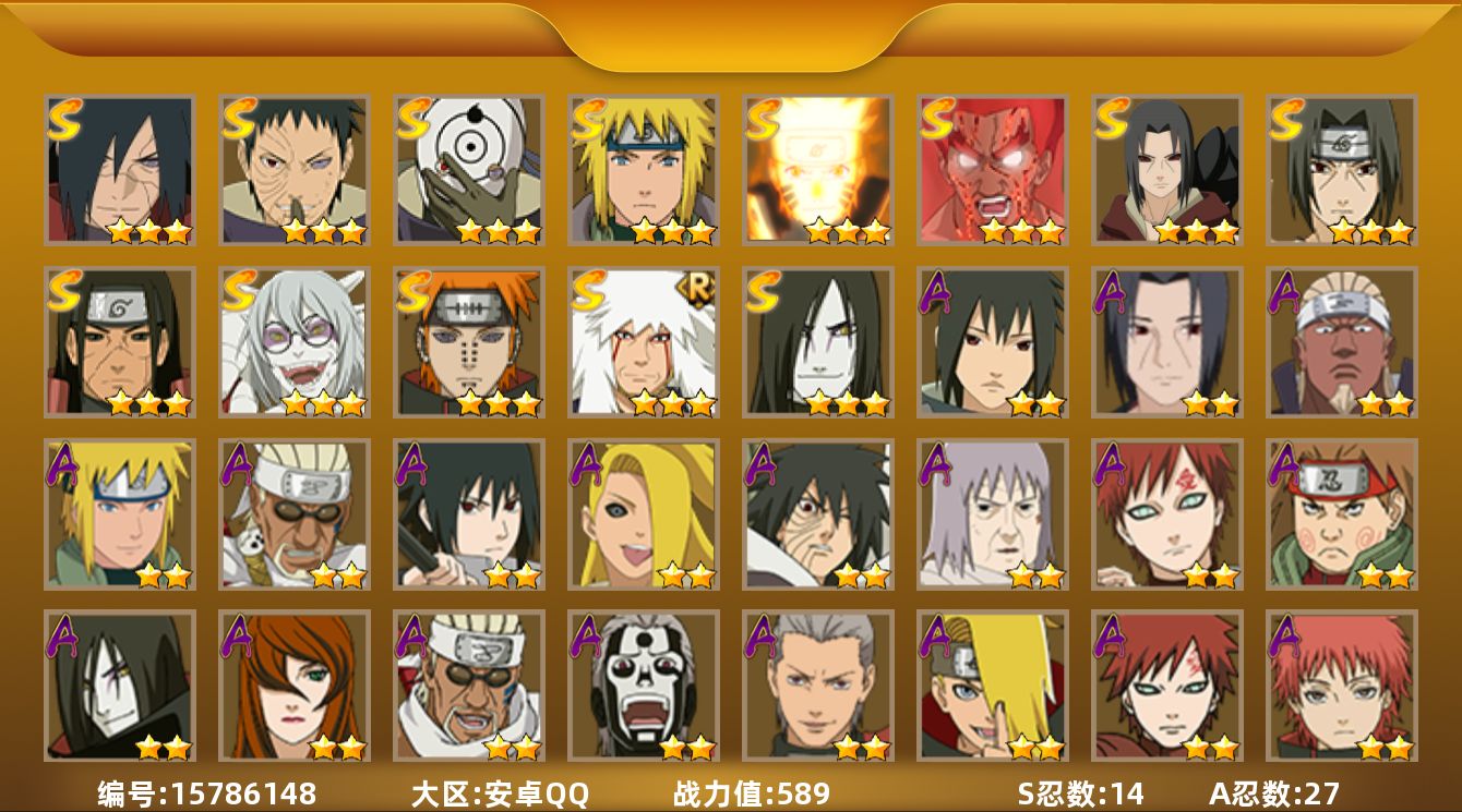 【S级忍者】:千手柱间「秽土转生」(3星),宇智波鼬「秽土转生」(3星),宇智波斑「秽土转生·解」(3星),宇智波带土「忍界大战」(3星),宇智波鼬「须佐能乎」(3星),自来也「舞之豪杰」(3星),大蛇丸(3星),波风水门(3星),药师兜「仙人模式」(3星),漩涡鸣人「九喇嘛连结」(3星),迈特凯「死门」(3星),佩恩「天道」(3星),宇智波斑 「白面具」(3星宇智波斑「白面具」),漩涡鸣人·宇智波佐助(3星)