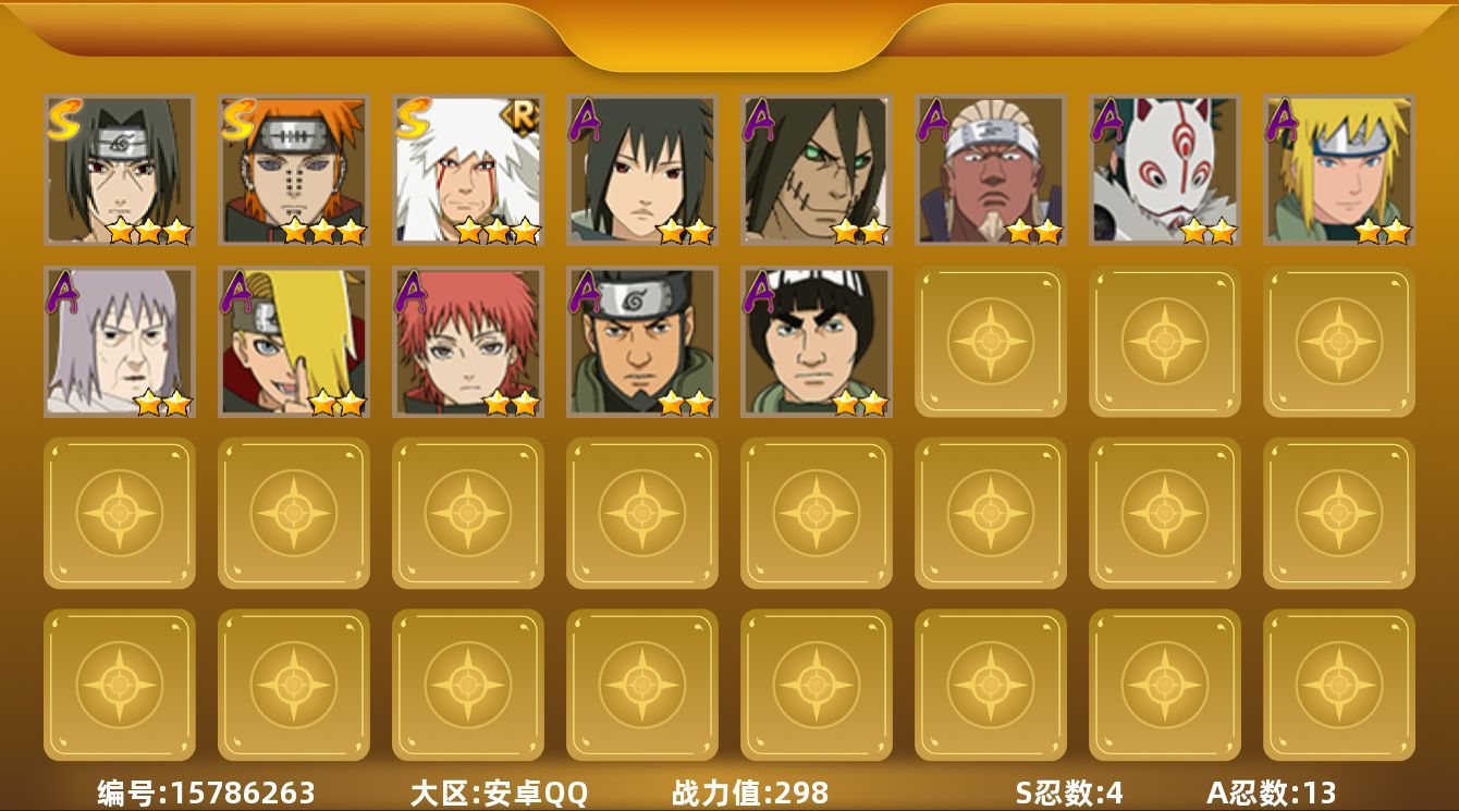 【S级忍者】:宇智波鼬「须佐能乎」(3星),自来也「舞之豪杰」(3星),佩恩「天道」(3星),漩涡鸣人·宇智波佐助(3星)