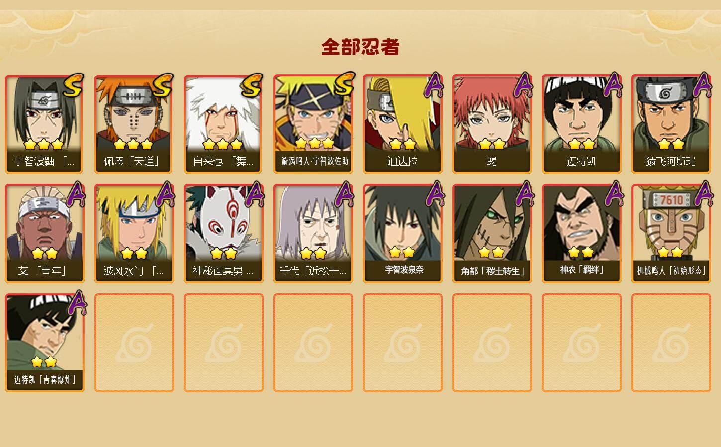 【A级忍者】:艾「青年」(2星),波风水门「青年」(2星),迪达拉(2星),机械鸣人「初始形态」(2星),迈特凯(2星),蝎(2星),角都「秽土转生」(2星),猿飞阿斯玛(2星),神秘面具男「忍者之路」(2星),千代「近松十人卫」(2星),神农「羁绊」(2星),宇智波泉奈(2星),迈特凯「青春爆炸」(2星)