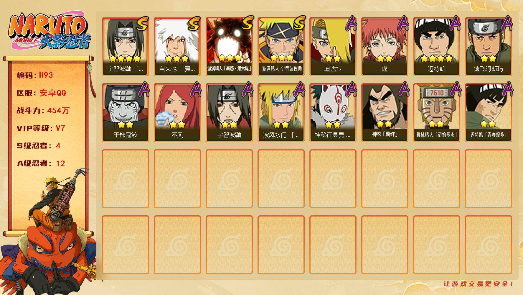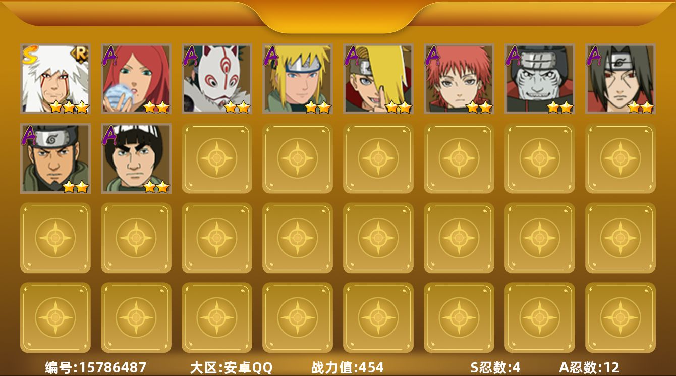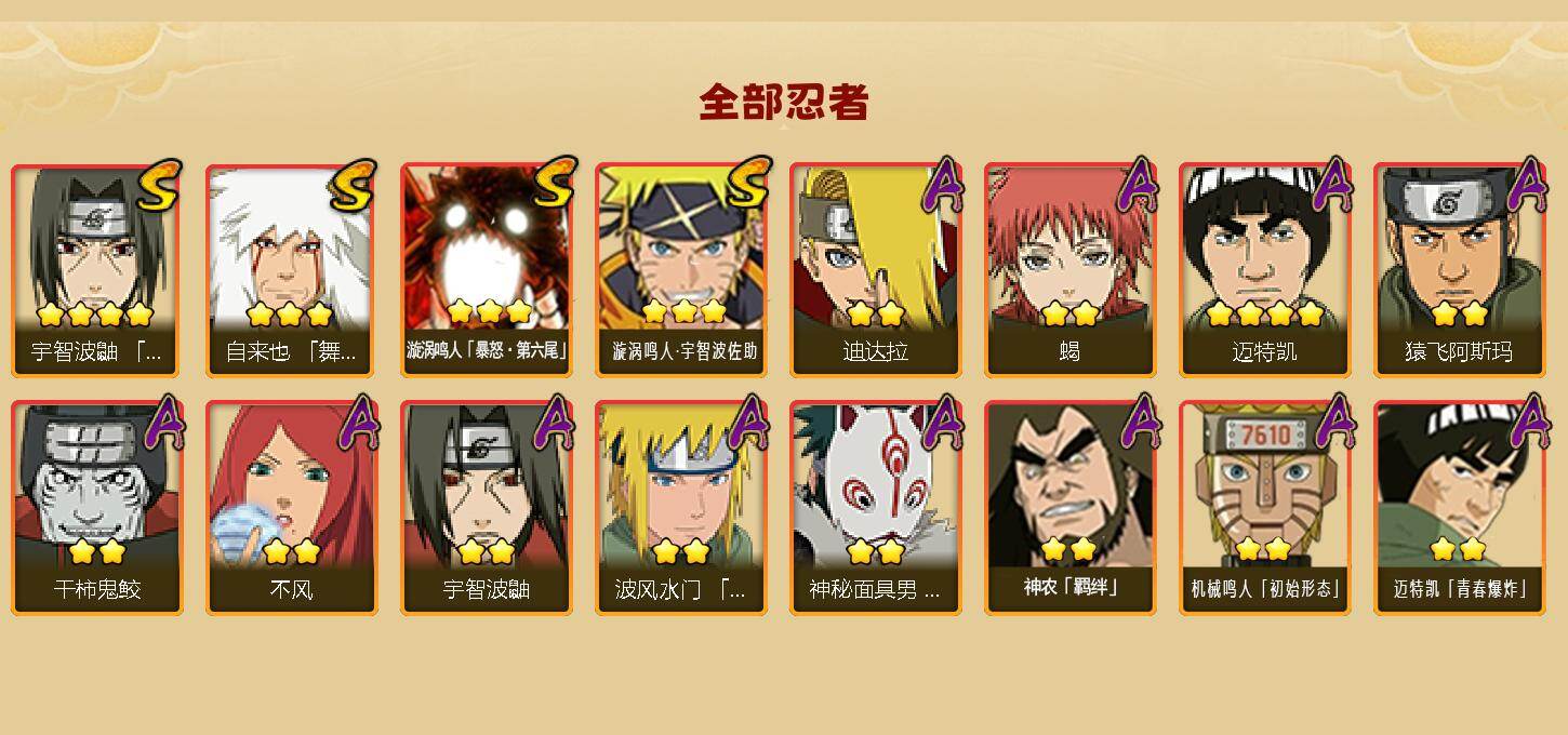 【S级忍者】:宇智波鼬「须佐能乎」(4星),自来也「舞之豪杰」(3星),漩涡鸣人「暴怒·第六尾」(3星),漩涡鸣人·宇智波佐助(3星)
