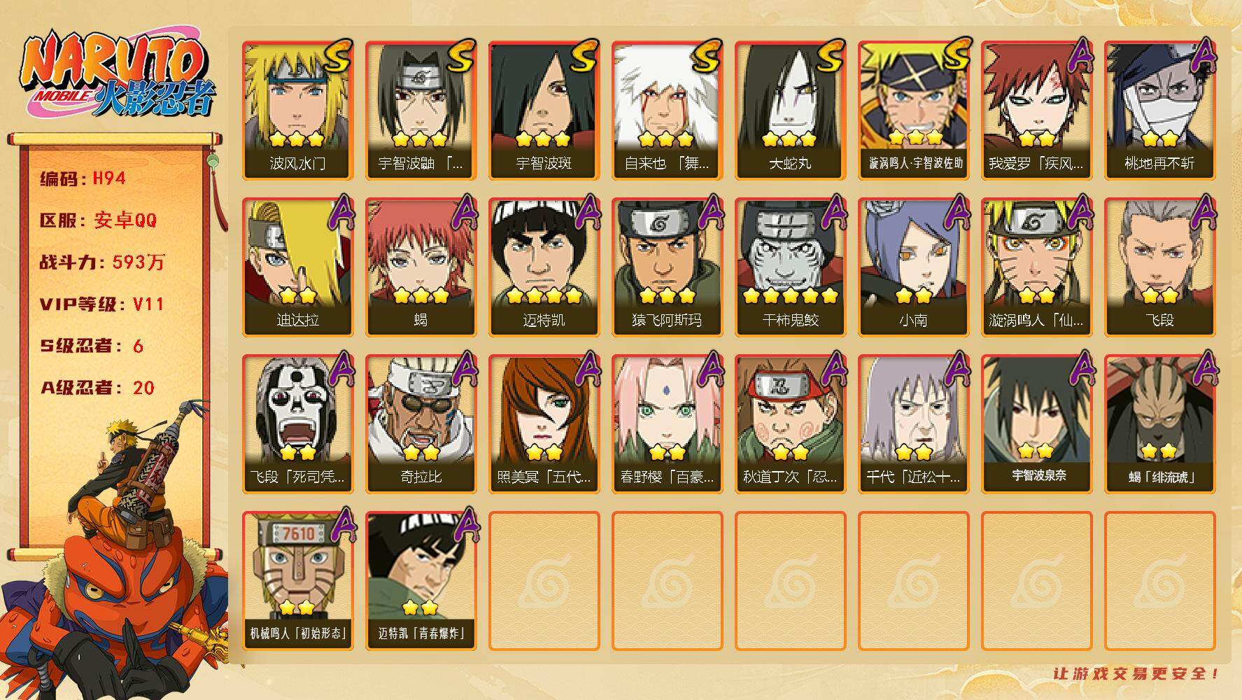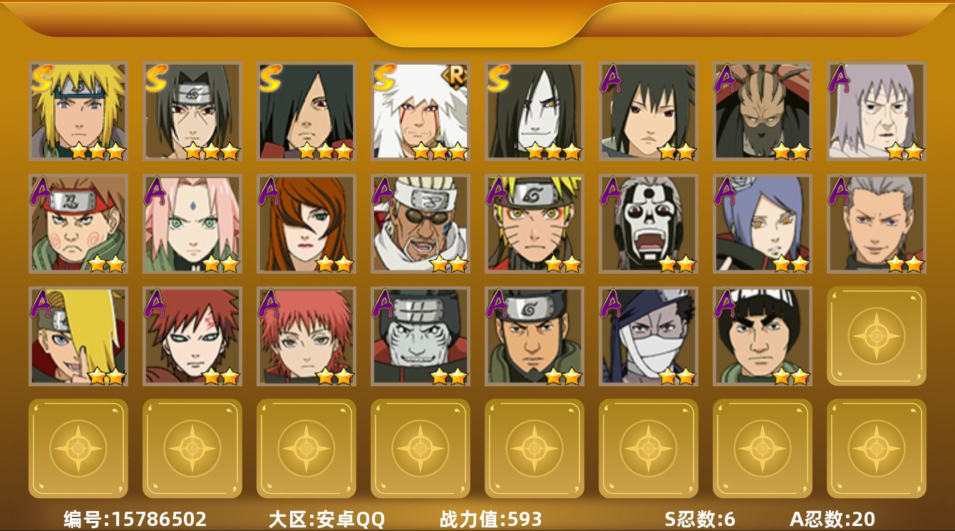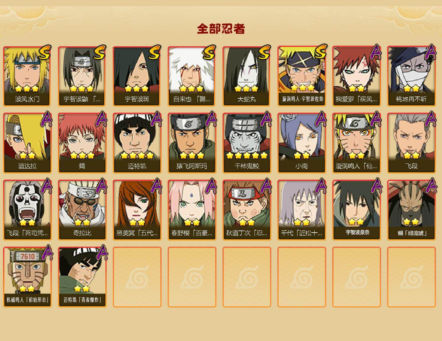 【S级忍者】:宇智波鼬「须佐能乎」(3星),自来也「舞之豪杰」(3星),大蛇丸(3星),宇智波斑(3星),波风水门(3星),漩涡鸣人·宇智波佐助(3星)
