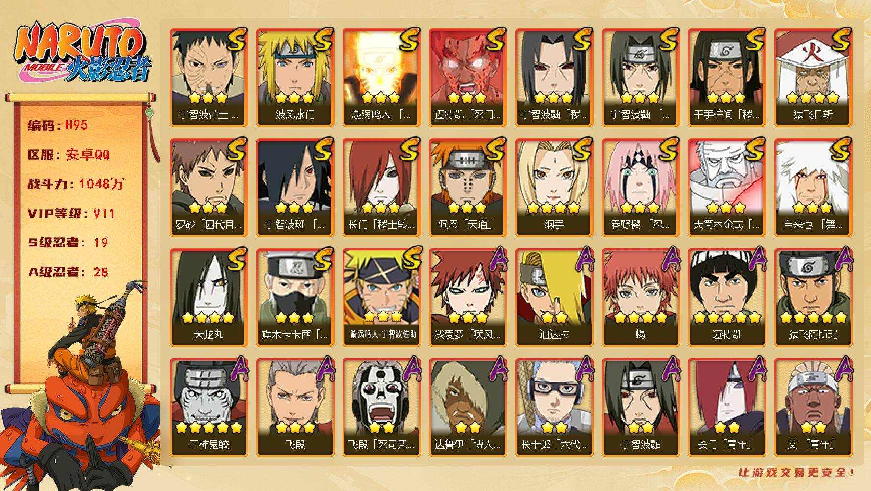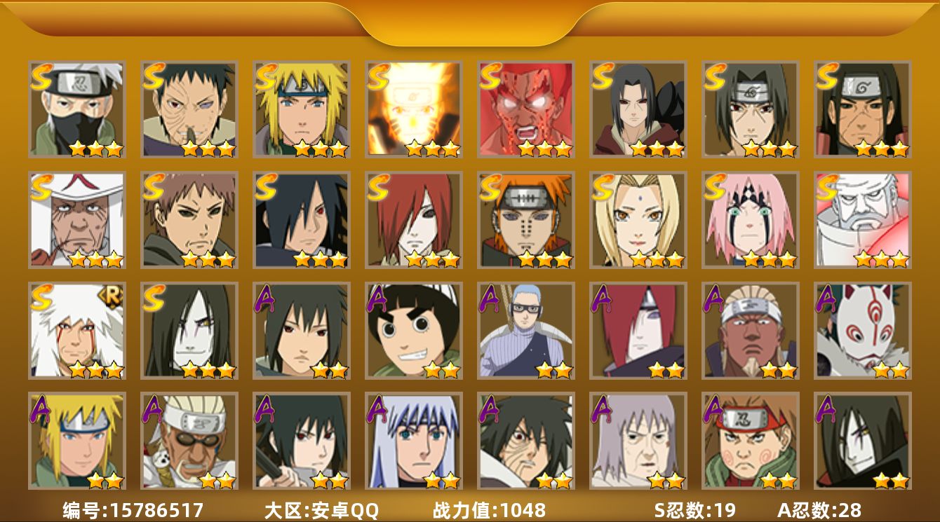 【S级忍者】:长门「秽土转生」(3星),千手柱间「秽土转生」(3星),宇智波鼬「秽土转生」(3星),春野樱「忍界大战」(3星),宇智波带土「忍界大战」(3星),宇智波鼬「须佐能乎」(3星),旗木卡卡西「须佐能乎」(3星),宇智波斑「木叶创立」(3星),罗砂「四代目风影」(3星),自来也「舞之豪杰」(3星),大蛇丸(4星),纲手(4星),猿飞日斩(4星),波风水门(3星),漩涡鸣人「九喇嘛连结」(3星),迈特凯「死门」(3星),佩恩「天道」(3星),大筒木金式(3星),漩涡鸣人·宇智波佐助(3星)