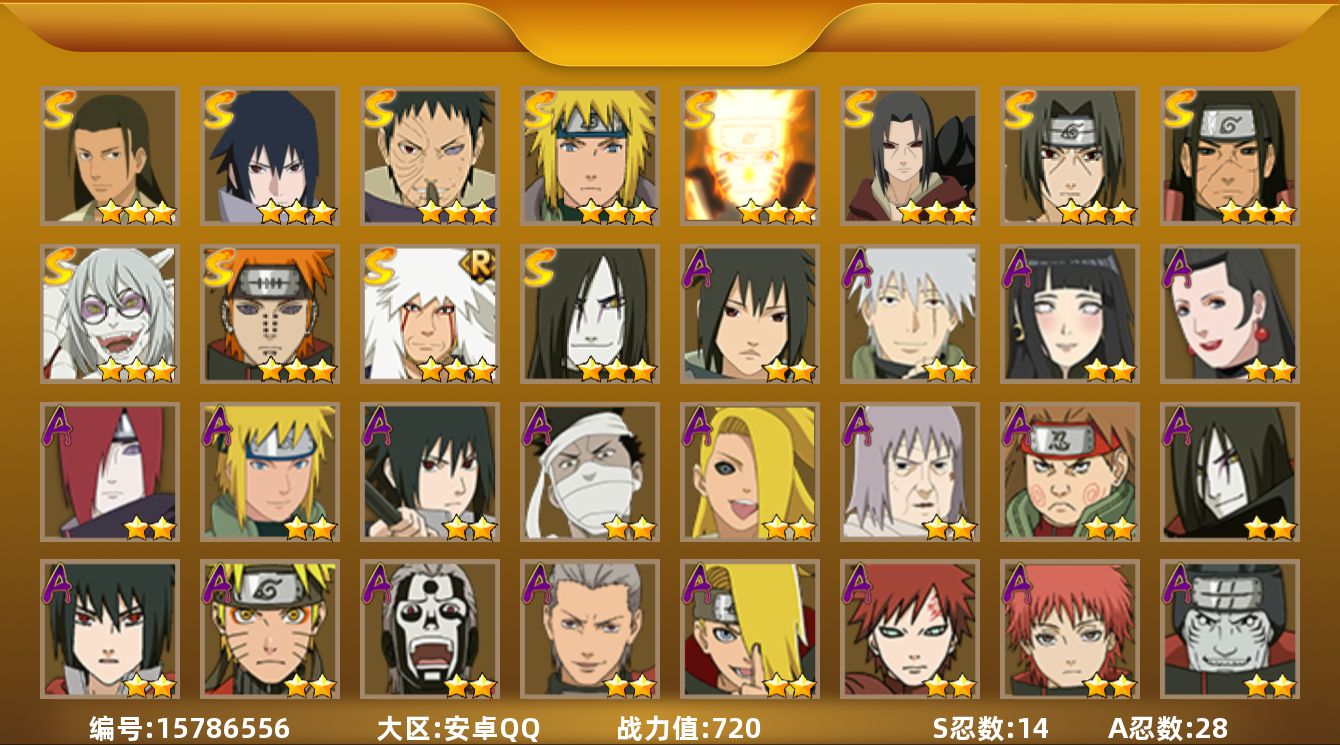 [15786556]14S级忍者数-28A级忍者数 【S级忍者】:千手柱间「秽土转生」(3星),宇智波鼬「秽土转生」(3星),宇智波带土「忍界大战」(3星),宇智波鼬「须佐能乎」(3星),千手柱间「木叶创立」(3星),自来也「舞之豪杰」(3星),大蛇丸(3星),自来也「传说中的三忍」(3星),波风水门(3星),药师兜「仙人模式」(3星),漩涡鸣人「九喇嘛连结」(3星),佩恩「天道」(3星),宇智波佐助「永恒万花筒」(3星),漩涡鸣人·宇智波佐助(3星) 【A级忍者】:长门「青年」(2星),波风水门「青年」(2星),达鲁伊「博人传」(2星),迪达拉(2星),迪达拉「秽土转生」(2星),大蛇丸「晓」(2星),飞段(3星),飞段「死司凭血」(2星),干柿鬼鲛(5星),漩涡鸣人「仙人模式」(2星),迈特凯(5星),旗木卡卡西「幻之真容」(2星),桃地再不斩「漂泊武士」(2星),桃地再不斩「秽土转生」(2星),我爱罗「疾风传」(2星),蝎(3星),猿飞阿斯玛(5星),宇智波鼬(2星),宇智波佐助「须佐能乎」(2星),宇智波佐助「万花筒写轮眼」(2星),日向雏田「最终章」(2星),宇智波带土「漂泊浪客」(2星),黑土「博人传」(2星),秋道丁次「忍界大战」(2星),千代「近松十人卫」(2星),不缘(2星),宇智波泉奈(2星),迈特凯「青春爆炸」(2星)