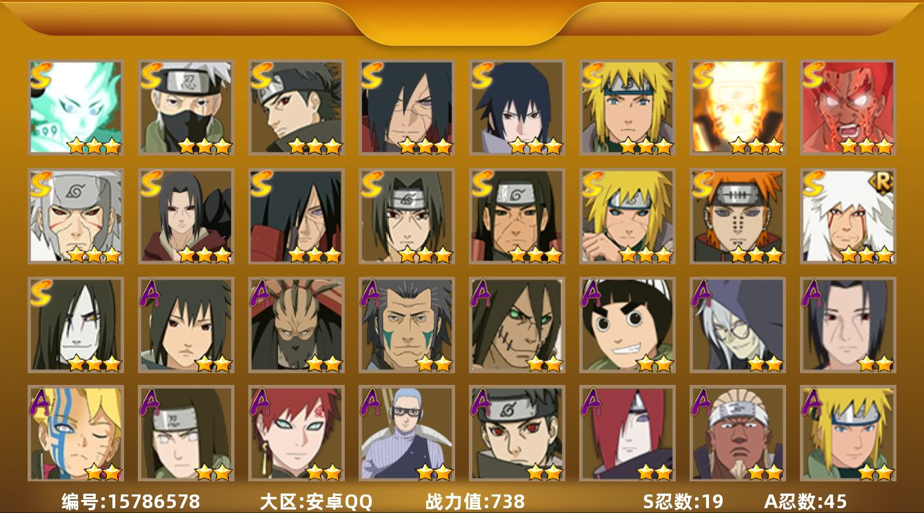 【S级忍者】:波风水门「秽土转生」(3星),千手扉间「秽土转生」(3星),千手柱间「秽土转生」(3星),宇智波鼬「秽土转生」(3星),宇智波斑「秽土转生」(3星),宇智波斑「秽土转生·解」(3星),宇智波鼬「须佐能乎」(3星),宇智波止水「须佐能乎」(3星),旗木卡卡西「须佐能乎」(3星),自来也「舞之豪杰」(3星),大蛇丸(3星),自来也「传说中的三忍」(3星),波风水门(3星),漩涡鸣人「九喇嘛连结」(3星),迈特凯「死门」(3星),佩恩「天道」(3星),宇智波佐助「永恒万花筒」(3星),大筒木舍人「最终章」(3星),漩涡鸣人·宇智波佐助(3星)