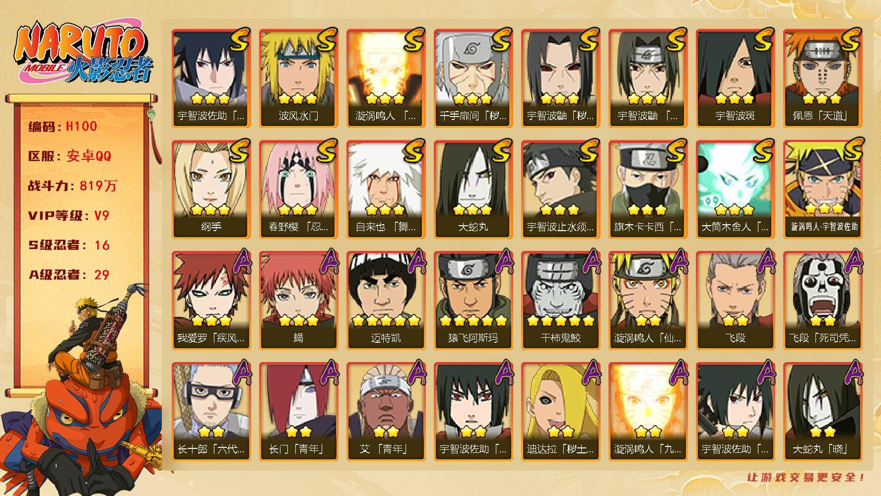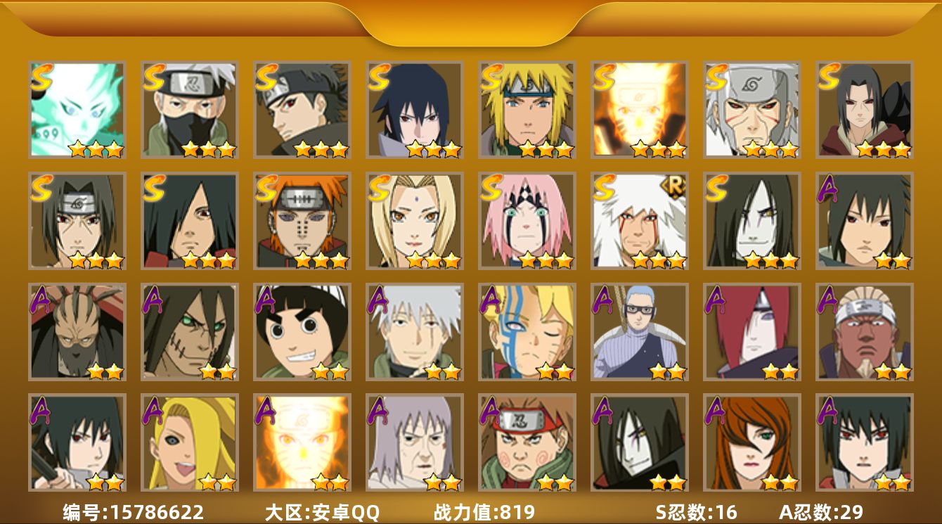 【S级忍者】:千手扉间「秽土转生」(3星),宇智波鼬「秽土转生」(3星),春野樱「忍界大战」(3星),宇智波鼬「须佐能乎」(3星),宇智波止水「须佐能乎」(3星),旗木卡卡西「须佐能乎」(3星),自来也「舞之豪杰」(3星),大蛇丸(3星),纲手(3星),宇智波斑(3星),波风水门(3星),漩涡鸣人「九喇嘛连结」(3星),佩恩「天道」(3星),宇智波佐助「永恒万花筒」(3星),大筒木舍人「最终章」(3星),漩涡鸣人·宇智波佐助(3星)