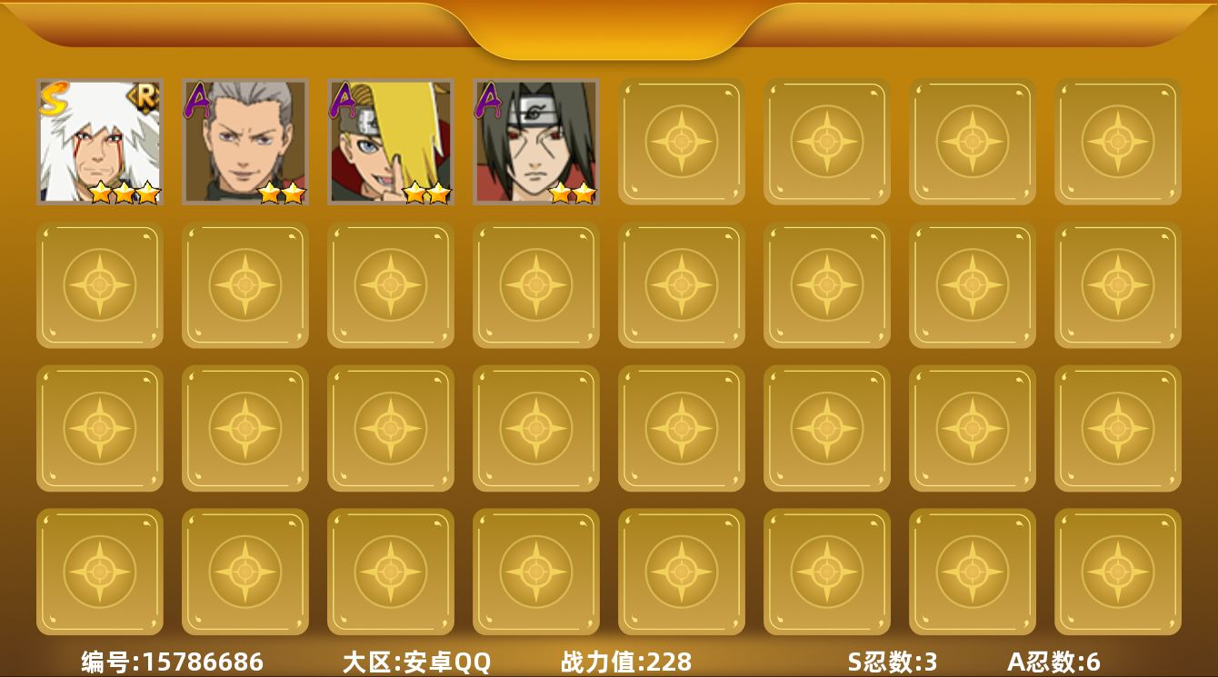 【S级忍者】:自来也「舞之豪杰」(3星),波风水门「九喇嘛连结」(3星),漩涡鸣人·宇智波佐助(3星)