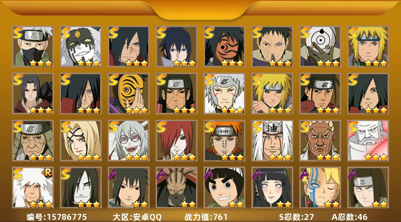 【S级忍者】:长门「秽土转生」(3星),猿飞日斩「秽土转生」(3星),波风水门「秽土转生」(3星),千手柱间「秽土转生」(3星),宇智波鼬「秽土转生」(3星),宇智波斑「秽土转生」(3星),宇智波斑「秽土转生·解」(3星),宇智波带土「忍界大战」(3星),宇智波鼬「须佐能乎」(4星),旗木卡卡西「须佐能乎」(3星),艾「四代目雷影」(3星),自来也(3星),自来也「舞之豪杰」(3星),大蛇丸(4星),纲手「百豪」(3星),千手柱间(3星),千手扉间(3星),宇智波斑(3星),波风水门(3星),药师兜「仙人模式」(3星),神秘面具男(3星),神秘面具男「红夜之刃」(3星),佩恩「天道」(4星),宇智波佐助「永恒万花筒」(3星),宇智波斑 「白面具」(3星宇智波斑「白面具」),大筒木金式(3星),大筒木桃式(3星)