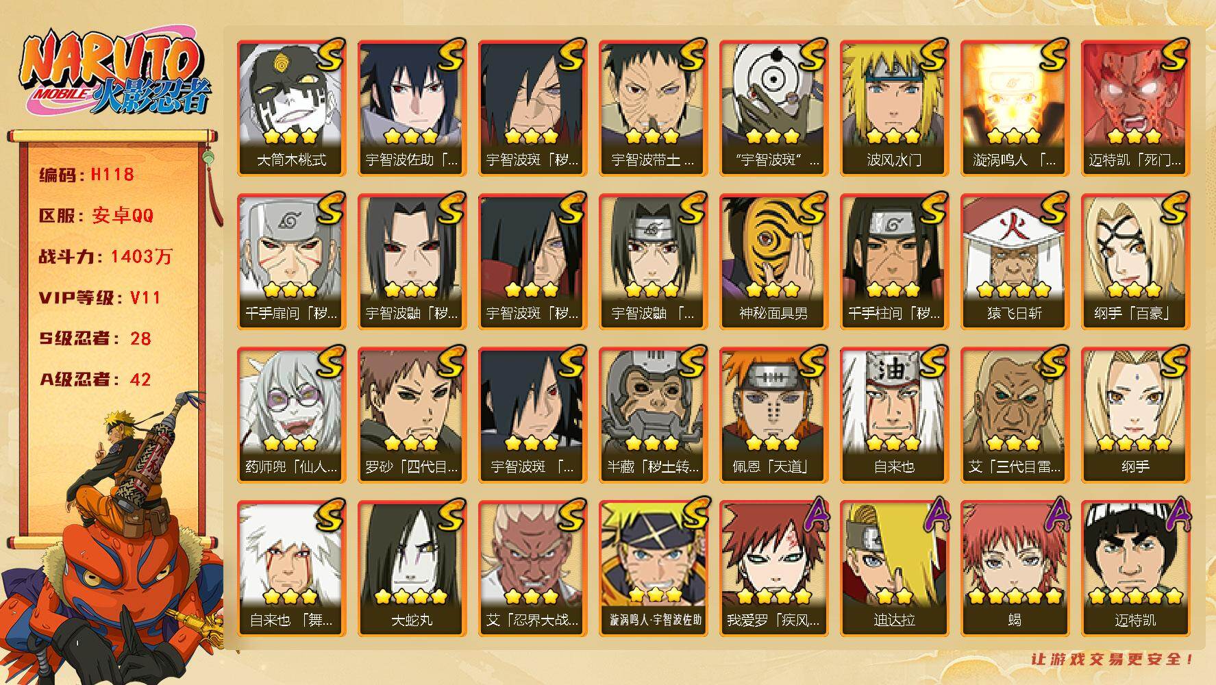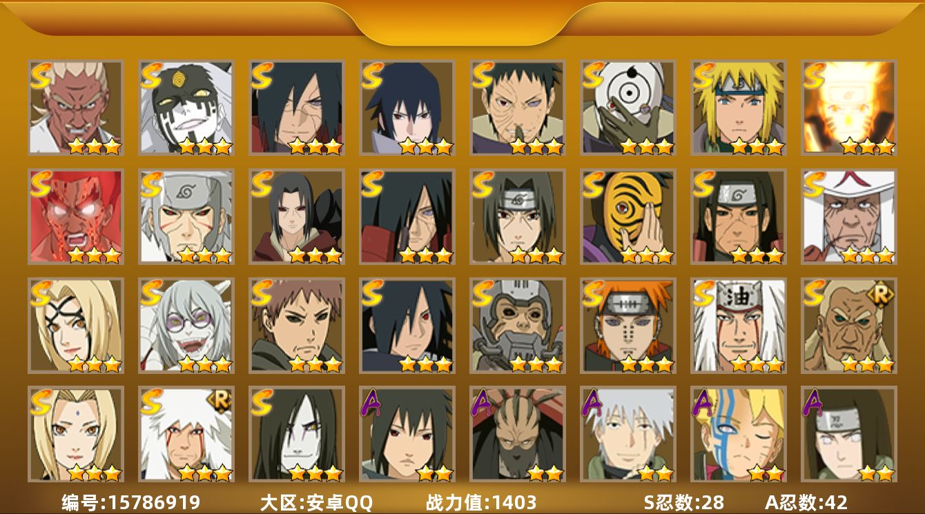 【S级忍者】:半藏「秽土转生」(3星),千手扉间「秽土转生」(3星),千手柱间「秽土转生」(3星),宇智波鼬「秽土转生」(3星),宇智波斑「秽土转生」(3星),宇智波斑「秽土转生·解」(3星),宇智波带土「忍界大战」(3星),艾「忍界大战」(3星),宇智波鼬「须佐能乎」(3星),宇智波斑「木叶创立」(3星),罗砂「四代目风影」(3星),艾「三代目雷影」(3星),自来也(3星),自来也「舞之豪杰」(3星),大蛇丸(4星),纲手(4星),纲手「百豪」(3星),猿飞日斩(4星),波风水门(3星),药师兜「仙人模式」(3星),神秘面具男(3星),漩涡鸣人「九喇嘛连结」(3星),迈特凯「死门」(3星),佩恩「天道」(3星),宇智波佐助「永恒万花筒」(3星),宇智波斑 「白面具」(3星宇智波斑「白面具」),大筒木桃式(3星),漩涡鸣人·宇智波佐助(3星)