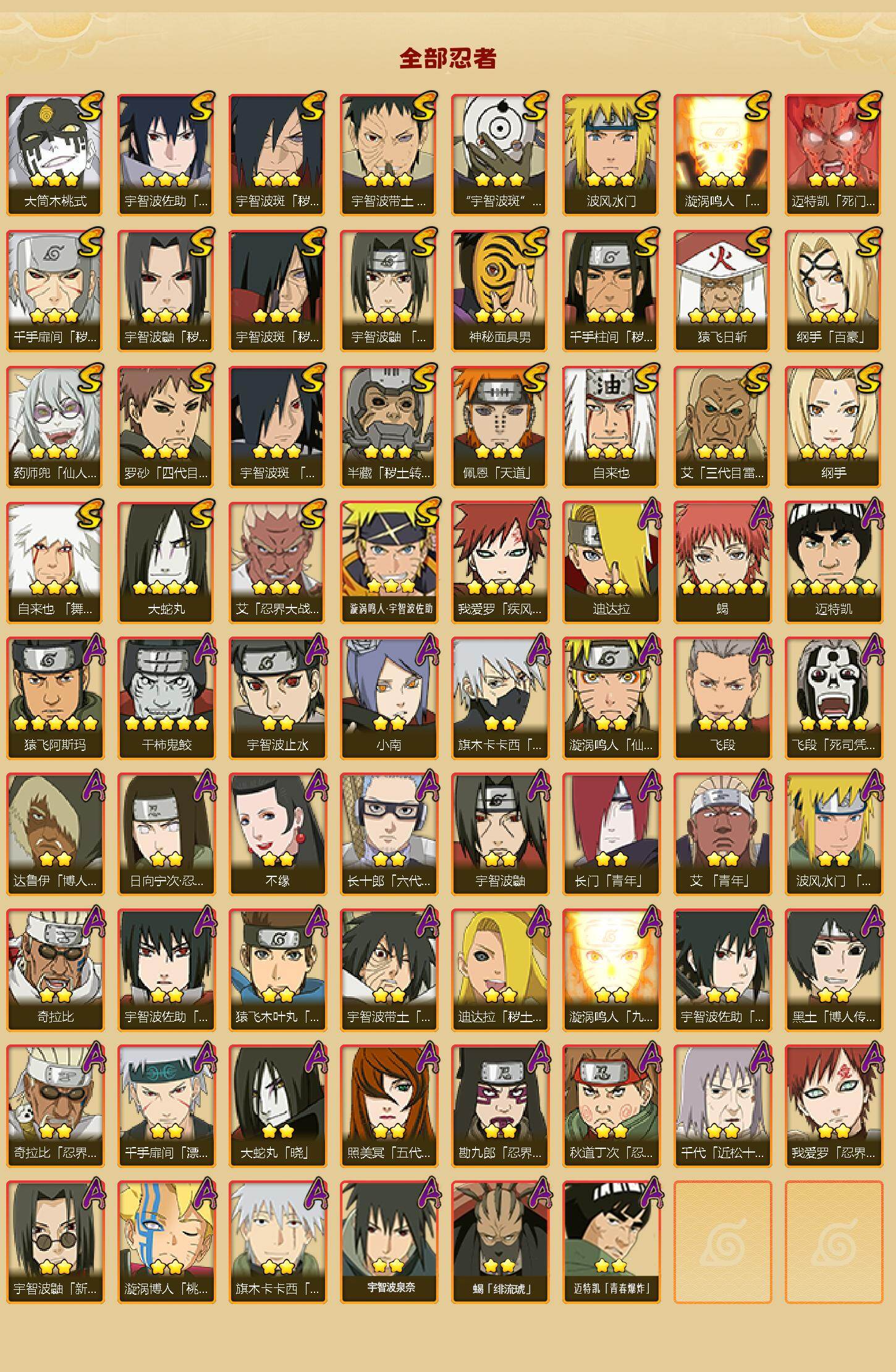 【A级忍者】:艾「青年」(2星),长门「青年」(2星),波风水门「青年」(2星),达鲁伊「博人传」(2星),迪达拉(2星),迪达拉「秽土转生」(2星),大蛇丸「晓」(2星),奇拉比(2星),奇拉比「忍界大战」(2星),飞段(3星),飞段「死司凭血」(4星),干柿鬼鲛(5星),漩涡博人「桃式显现」(2星),漩涡鸣人「仙人模式」(2星),漩涡鸣人「九尾查克拉」(2星),迈特凯(5星),旗木卡卡西「万花筒写轮眼」(2星),旗木卡卡西「幻之真容」(2星),我爱罗「疾风传」(4星),我爱罗「忍界大战」(2星),蝎(5星),蝎「绯流琥」(2星),小南(2星),猿飞阿斯玛(5星),宇智波止水(2星),宇智波鼬(2星),宇智波鼬「新春限定」(2星),宇智波佐助「须佐能乎」(2星),宇智波佐助「万花筒写轮眼」(2星),照美冥「五代目水影」(2星),日向宁次「忍界大战」(2星),宇智波带土「暴怒」(2星),长十郎「六代目水影」(2星),猿飞木叶丸「博人传」(2星),黑土「博人传」(2星),千手扉间「漂泊武士」(2星),勘九郎「忍界大战」(2星),秋道丁次「忍界大战」(2星),千代「近松十人卫」(2星),不缘(2星),宇智波泉奈(2星),迈特凯「青春爆炸」(2星)