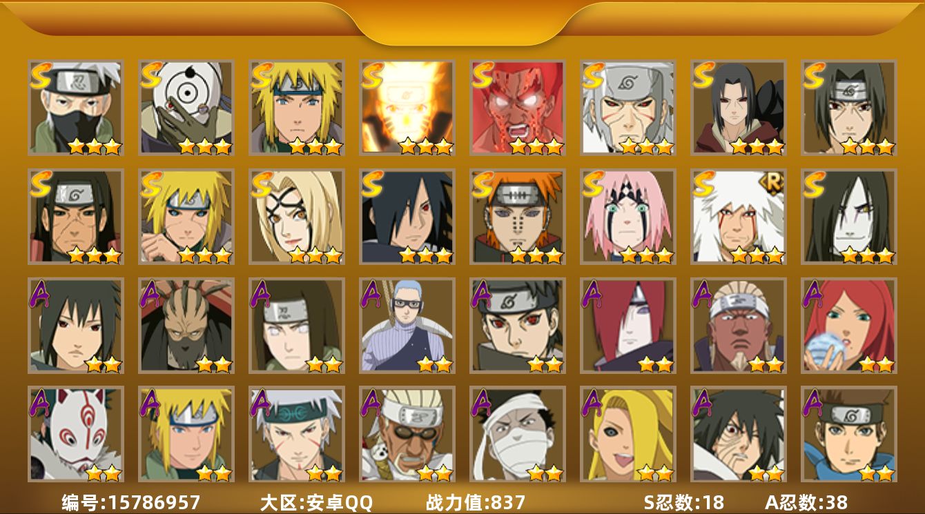 [15786957]18S级忍者数-38A级忍者数 【S级忍者】:波风水门「秽土转生」(3星),千手扉间「秽土转生」(3星),千手柱间「秽土转生」(3星),宇智波鼬「秽土转生」(3星),春野樱「忍界大战」(3星),宇智波鼬「须佐能乎」(3星),旗木卡卡西「须佐能乎」(3星),宇智波斑「木叶创立」(3星),自来也「舞之豪杰」(3星),大蛇丸(3星),自来也「传说中的三忍」(3星),纲手「百豪」(3星),波风水门(3星),漩涡鸣人「九喇嘛连结」(3星),迈特凯「死门」(3星),佩恩「天道」(3星),宇智波斑 「白面具」(3星宇智波斑「白面具」),漩涡鸣人·宇智波佐助(3星) 【A级忍者】:艾「青年」(2星),长门「青年」(2星),波风水门「青年」(2星),达鲁伊「博人传」(2星),迪达拉「秽土转生」(2星),奇拉比「忍界大战」(2星),飞段(4星),飞段「死司凭血」(3星),干柿鬼鲛(5星),漩涡鸣人「九尾查克拉」(3星),迈特凯(5星),旗木卡卡西「万花筒写轮眼」(2星),桃地再不斩「漂泊武士」(2星),桃地再不斩「秽土转生」(2星),我爱罗「疾风传」(3星),蝎(3星),蝎「绯流琥」(2星),角都「地怨虞」(2星),猿飞阿斯玛(5星),宇智波止水(2星),猿飞日斩「火影继承人」(2星),宇智波鼬(2星),药师兜「半蛇斗篷」(2星),照美冥「五代目水影」(2星),日向宁次「忍界大战」(2星),宇智波带土「暴怒」(2星),长十郎「六代目水影」(2星),神秘面具男「忍者之路」(2星),猿飞木叶丸「博人传」(2星),黑土「博人传」(2星),千手扉间「漂泊武士」(2星),秋道丁次「忍界大战」(2星),千代「近松十人卫」(2星),不风(2星),宇智波泉奈(2星),巳月「仙人模式」(2星),纲手「妖怪奇谭」(2星),迈特凯「青春爆炸」(2星)