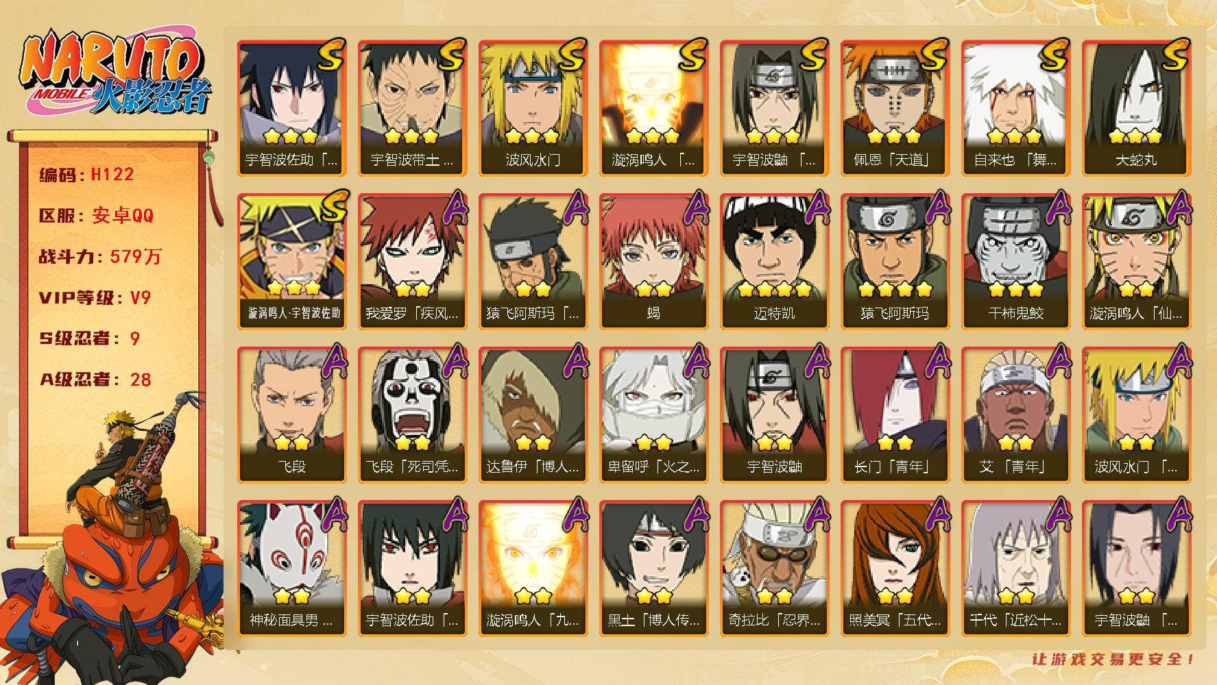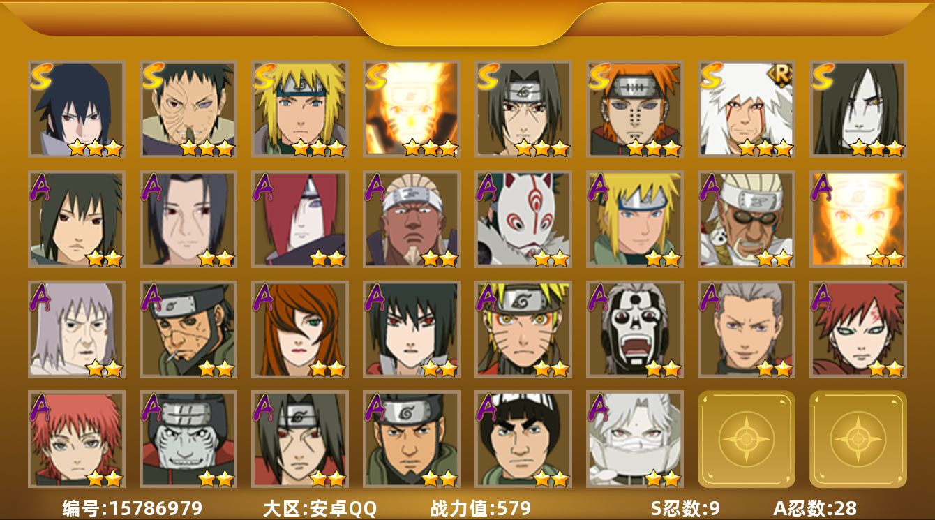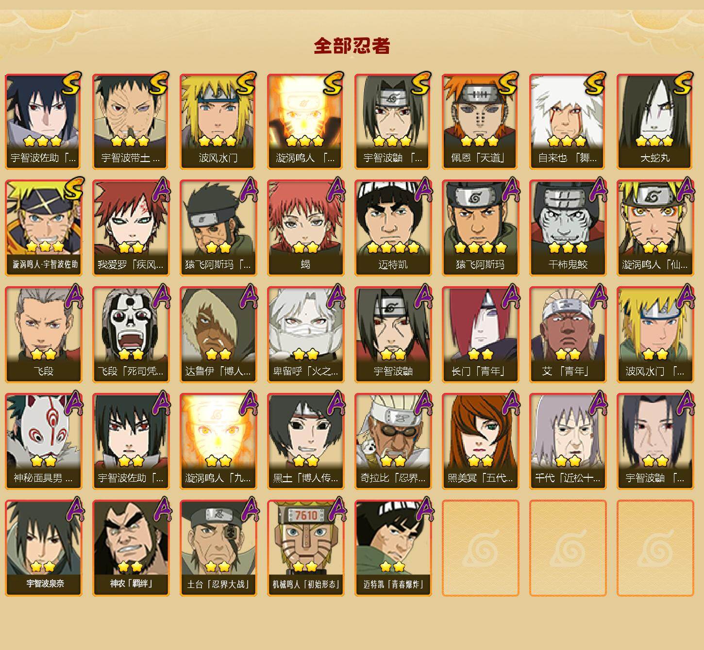 【S级忍者】:宇智波带土「忍界大战」(3星),宇智波鼬「须佐能乎」(3星),自来也「舞之豪杰」(3星),大蛇丸(3星),波风水门(3星),漩涡鸣人「九喇嘛连结」(3星),佩恩「天道」(3星),宇智波佐助「永恒万花筒」(3星),漩涡鸣人·宇智波佐助(3星)