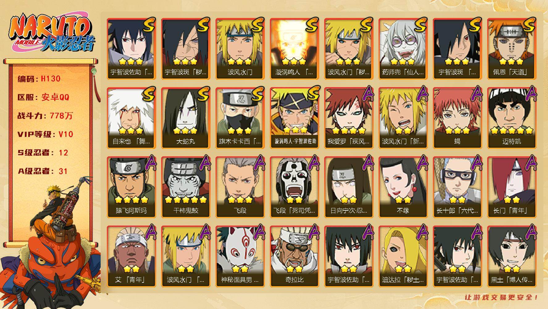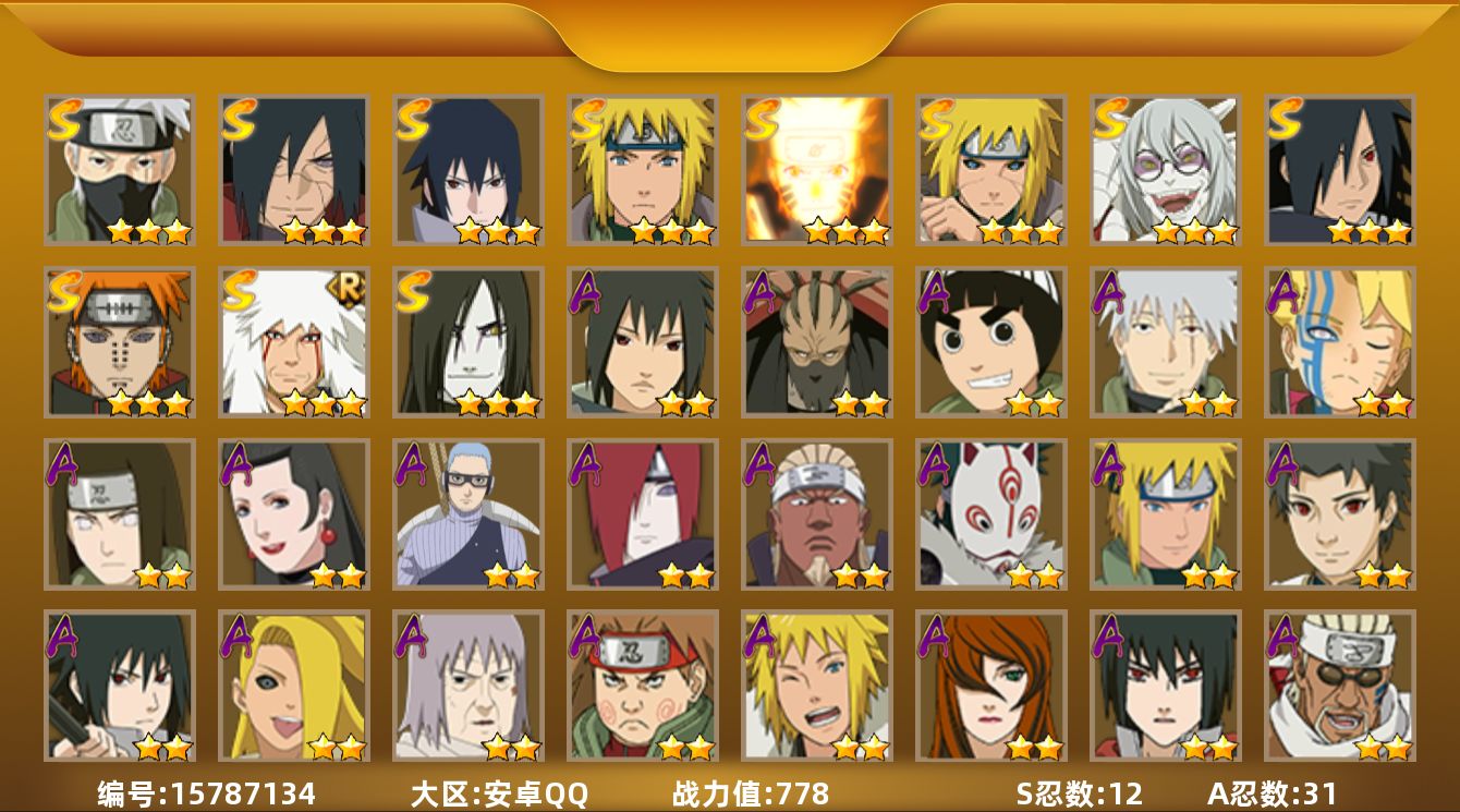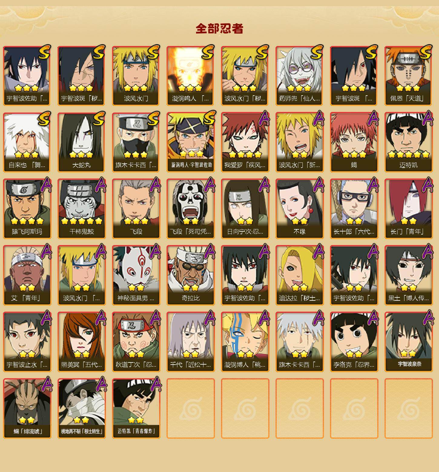 【S级忍者】:波风水门「秽土转生」(3星),宇智波斑「秽土转生·解」(3星),旗木卡卡西「须佐能乎」(3星),宇智波斑「木叶创立」(3星),自来也「舞之豪杰」(3星),大蛇丸(3星),波风水门(3星),药师兜「仙人模式」(3星),漩涡鸣人「九喇嘛连结」(3星),佩恩「天道」(3星),宇智波佐助「永恒万花筒」(3星),漩涡鸣人·宇智波佐助(3星)