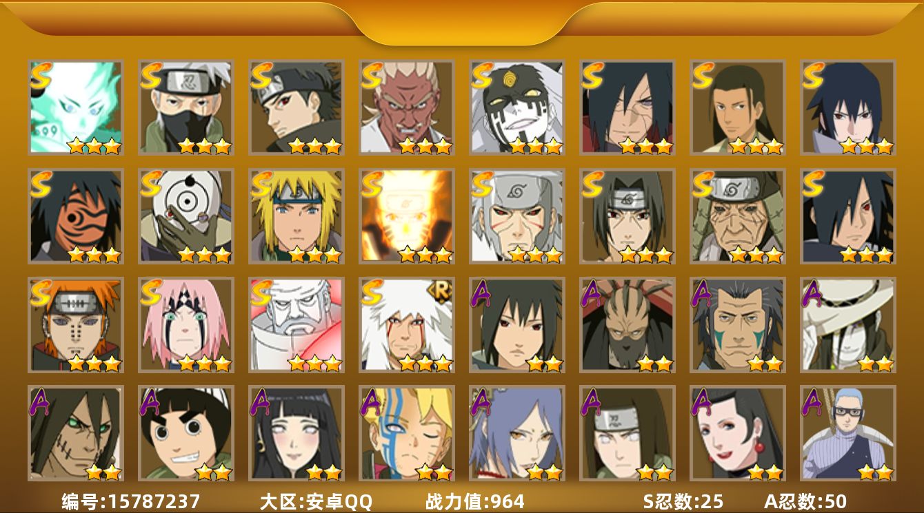 [15787237]25S级忍者数-50A级忍者数 【S级忍者】:猿飞日斩「秽土转生」(3星),千手扉间「秽土转生」(3星),宇智波斑「秽土转生·解」(3星),春野樱「忍界大战」(3星),艾「忍界大战」(3星),宇智波鼬「须佐能乎」(3星),宇智波止水「须佐能乎」(3星),旗木卡卡西「须佐能乎」(3星),宇智波斑「木叶创立」(3星),千手柱间「木叶创立」(3星),自来也「舞之豪杰」(3星),自来也「传说中的三忍」(3星),波风水门(3星),神秘面具男「红夜之刃」(3星),漩涡鸣人「九喇嘛连结」(3星),佩恩「天道」(3星),宇智波佐助「永恒万花筒」(3星),宇智波斑 「白面具」(3星宇智波斑「白面具」),大筒木金式(3星),大筒木桃式(3星),大筒木舍人「最终章」(3星),漩涡鸣人「暴怒·第六尾」(3星),波风水门「九喇嘛连结」(3星),宇智波斑「五影会谈」(3星),漩涡鸣人·宇智波佐助(3星) 【A级忍者】:艾「青年」(2星),长门「青年」(2星),波风水门「青年」(2星),迪达拉(2星),迪达拉「秽土转生」(2星),大蛇丸「新春限定」(2星),飞段(3星),飞段「死司凭血」(2星),飞段「晓创生」(2星),干柿鬼鲛(3星),漩涡博人「桃式显现」(2星),漩涡鸣人「九尾查克拉」(2星),机械鸣人「初始形态」(2星),迈特凯(3星),迈特凯「惊门」(2星),桃地再不斩「秽土转生」(2星),我爱罗「疾风传」(3星),蝎(2星),蝎「晓创生」(2星),蝎「绯流琥」(2星),小南「漂泊浪客」(2星),角都「地怨虞」(2星),角都「秽土转生」(2星),猿飞阿斯玛(3星),宇智波止水「新春限定」(2星),宇智波鼬(2星),宇智波佐助「须佐能乎」(2星),宇智波佐助「万花筒写轮眼」(2星),照美冥「五代目水影」(2星),日向宁次「忍界大战」(2星),日向雏田「最终章」(2星),宇智波带土「暴怒」(2星),宇智波带土「漂泊浪客」(2星),长十郎「六代目水影」(2星),纲手「侠隐江湖」(2星),佩恩·六道「漂泊浪客」(2星),李洛克「忍界大战」(3星),黑土「博人传」(2星),春野樱「百豪」(2星),秋道丁次「忍界大战」(2星),千代「近松十人卫」(2星),神农「羁绊」(2星),土台「忍界大战」(2星),不缘(2星),加藤断(2星),宇智波泉奈(2星),不动(2星),巳月「仙人模式」(2星),纲手「