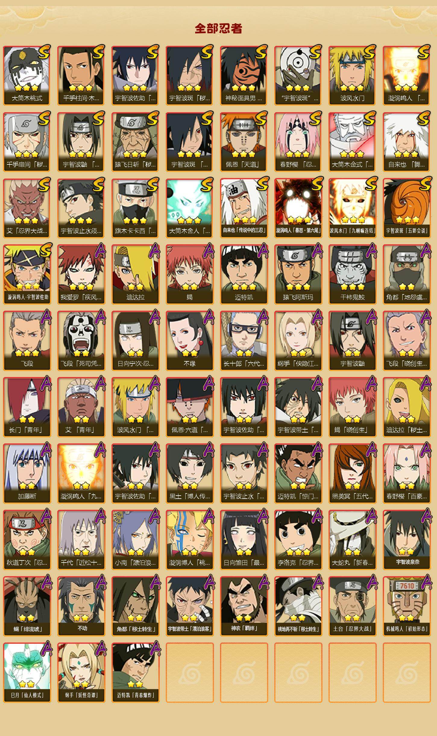 【A级忍者】:艾「青年」(2星),长门「青年」(2星),波风水门「青年」(2星),迪达拉(2星),迪达拉「秽土转生」(2星),大蛇丸「新春限定」(2星),飞段(3星),飞段「死司凭血」(2星),飞段「晓创生」(2星),干柿鬼鲛(3星),漩涡博人「桃式显现」(2星),漩涡鸣人「九尾查克拉」(2星),机械鸣人「初始形态」(2星),迈特凯(3星),迈特凯「惊门」(2星),桃地再不斩「秽土转生」(2星),我爱罗「疾风传」(3星),蝎(2星),蝎「晓创生」(2星),蝎「绯流琥」(2星),小南「漂泊浪客」(2星),角都「地怨虞」(2星),角都「秽土转生」(2星),猿飞阿斯玛(3星),宇智波止水「新春限定」(2星),宇智波鼬(2星),宇智波佐助「须佐能乎」(2星),宇智波佐助「万花筒写轮眼」(2星),照美冥「五代目水影」(2星),日向宁次「忍界大战」(2星),日向雏田「最终章」(2星),宇智波带土「暴怒」(2星),宇智波带土「漂泊浪客」(2星),长十郎「六代目水影」(2星),纲手「侠隐江湖」(2星),佩恩·六道「漂泊浪客」(2星),李洛克「忍界大战」(3星),黑土「博人传」(2星),春野樱「百豪」(2星),秋道丁次「忍界大战」(2星),千代「近松十人卫」(2星),神农「羁绊」(2星),土台「忍界大战」(2星),不缘(2星),加藤断(2星),宇智波泉奈(2星),不动(2星),巳月「仙人模式」(2星),纲手「