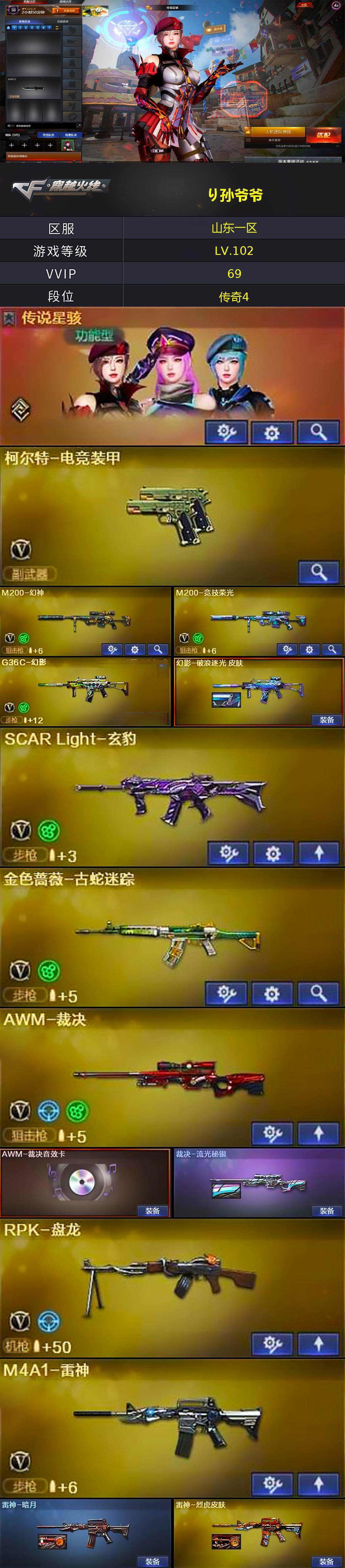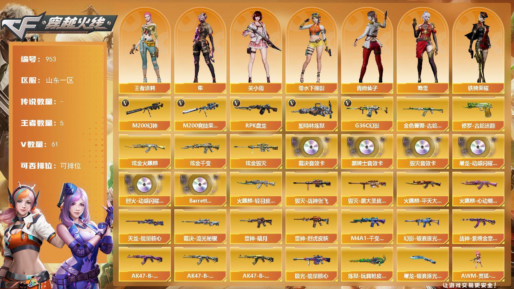 - [13118114]山东一区-154V-11王者-1炫金 【传说武器】:传说梦魇,传说灵眸 【热门武器】:传说梦魇,传说灵眸,G36C-幻影,QBZ03-金色蔷薇,M14EBR-玄武,Scar Light-白虎,HK417-朱雀,M4A1-青龙,M200-幻神*2,M200-竞技荣光,凤吟之魄,白虎-电玩蓝兔,柯尔特-冠军之特,金色小号,Cat-刀锋,牛牛-AK47,M4A1-黑骑士*3,汤姆逊-烈龙*6,RPK-盘龙*4,加特林-炼狱*2,斯泰尔-蝴蝶,羊驼玩偶,雷神-小红,裁决-雪莉杨,COP-白鲨,USP-雷暴*2,COP 357-幻灵*2,沙鹰-修罗*7,Knife-冠军之刃*2,炽芒蝶刃,黄金猫猫手套-白鲨,金刚伞 【王者炫金武器】:凤吟之魄,王者玄武,炫金天龙 【音效卡】:M200-幻神音效卡,M4A1-黑骑士音效卡,Barrett-毁灭音效卡,AWM-裁决音效卡,Scar Light-白虎音效卡,绝迹语音包,HK417-朱雀音效卡,女战神梧桐语音包 【皮肤】:M200-幻神-黄忠皮肤,幻神-冠军之幻,幻神-宠儿-2021MVP,M200-幻神-荣耀世冠白鲨,M200-幻神-N9-2022MVP,白虎-白鲨-CFPLS23冠军,QBZ03-冠军之薇,QBZ03-AG-CFPLS19冠军,AWM-裁决-凤灵皮肤,裁决-巅峰荣耀 皮肤,雷神-暗月*2,雷神-荣耀之魄,雷神-传奇N9,雷神-宠儿-2019MVP,雷神-机甲刑天皮肤,雷神-宇航兔皮肤,雷神-炽焰魔龙,雷神-云海游龙皮肤,雷神-源计划2.0专属 皮肤,火麒麟-平天大圣*2,火麒麟-虎牙平台皮肤,火麒麟-心动糖果,毁灭-黑大圣皮肤*2,M4A1-千变-孔明皮肤,黑骑士-暗月,黑骑士-CFS2021,黑骑士-AG-S4冠军典藏,无影-能量核心,战神-紫绶金章皮肤,战神-流金岁月皮肤*2,极光-能量核心,修罗耀金皮肤,修罗-冠军之魂,修罗-15周年嘉年华 皮肤,天神-暗月,屠龙-荣耀之锋,屠龙-QQ会员,屠龙-星火燎原,麒麟刺-萌杀皮肤 【角色】:魅影,春,影豹,电竞教官-云悠悠,雾萌萌,隐,战地猎狐,王者-瞳-闭月羞花,奇洋探员,乔伊教练,云海玲珑,空,暗夜-X,初恋灵狐,飞虎队-X,风暴女,虎妞,嘉年华灵狐,娟娟,兰-新年限定,灵动武士,灵狐者-X,灵狐者-七夕宝贝,龙儿-小淘气,曼陀罗-X,曼陀罗-礼服,女主播,潘
