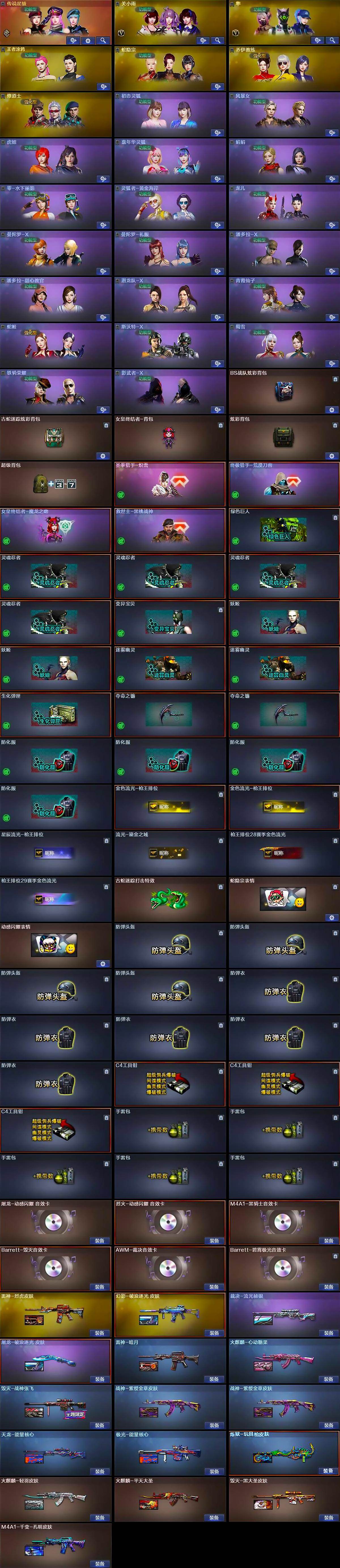 - [16848415]四川二区-32V-0王者武器数-0炫金武器数 【热门武器】:QBZ03-金色蔷薇,M200-幻神,M4A1-黑骑士,COP 357-幻灵 【音效卡】:M4A1-雷神-云海游龙音效卡 【皮肤】:雷神-耀金皮肤,火麒麟-大唐荣光,火麒麟-心动糖果,黑龙-能量核心 【角色】:岚兮儿,王者凌霄,王者潘多拉,云海玲珑,芳心审判者,风暴女,嘉年华灵狐,娟娟,兰-新年限定,兰妹妹,猎狐者-追月,灵狐-花神,灵狐者-X,灵狐者-职业经理,麻雀,曼陀罗-X,萌儿,潘多拉-X,斯沃特-X,蜀雪,兔囡囡,影武者-X 【人偶武器】:AWM-灵狐-15周年嘉年华,迷你深渊冰龙,迷你裂空之翼,迷你牛魔王,迷你波特博士*2,夺魂,迷你火种,生化手雷-机甲核心,深渊终结者手雷*2,迷你巨石泰坦-魔花研究所 【暴走生化】:超级对讲机 【挑战大师】:冰龙粉碎者-白马银枪,激光毁灭者III-白马银枪,VEPR-12-金魔,机甲撕裂者III,神圣爆裂者-末日III,阐释者III 【英雄级武器】:AK47-火麒麟,M4A1-雷神*2,M4A1-黑骑士,无影-神兵利器,QBZ03-金色蔷薇,M200-幻神,烈龙-云海游龙,COP 357-幻灵,幻灵之锋,擎天-云海游龙,屠龙-云海游龙,高爆手雷-幻灵*4,手雷-云海游龙,闪光弹-幻灵*4,烟雾弹-幻灵*4 【道具】:云海游龙炫彩背包,炫彩背包,超级背包,绿色巨人,灵魂忍者,变异宝贝,迷雾幽灵,夺命之镰*2,防化服*3,金色流光-枪王排位*2,星辰流光-枪王排位,云海游龙表情,防弹头盔*2,防弹衣*2,C4工具钳*2,手雷包*2 【特殊枪械】:1黑骑士