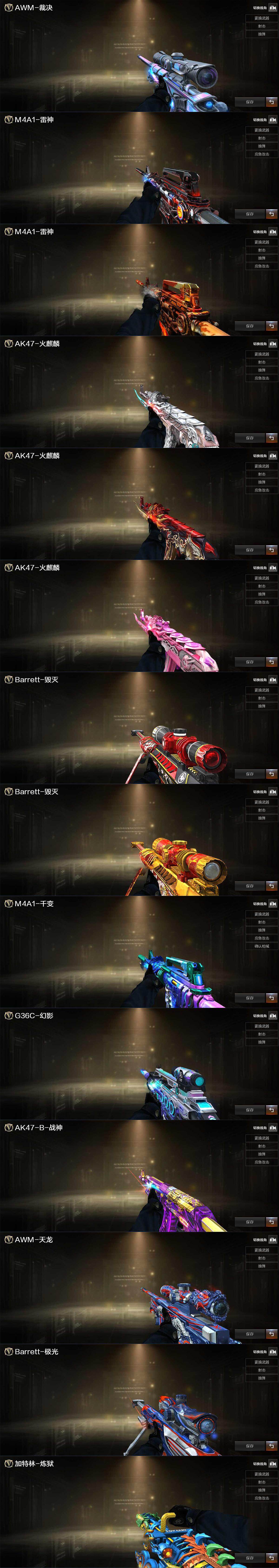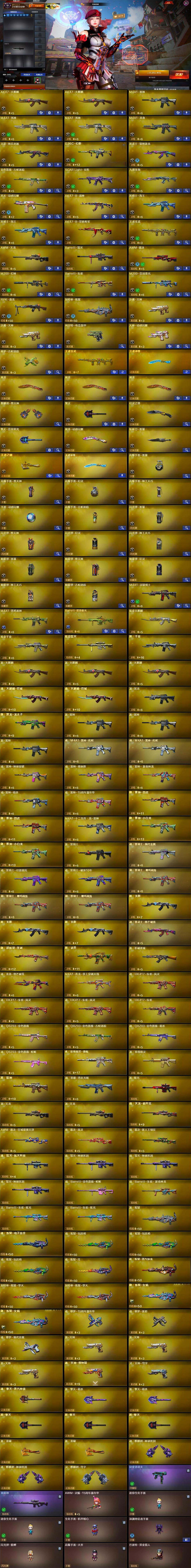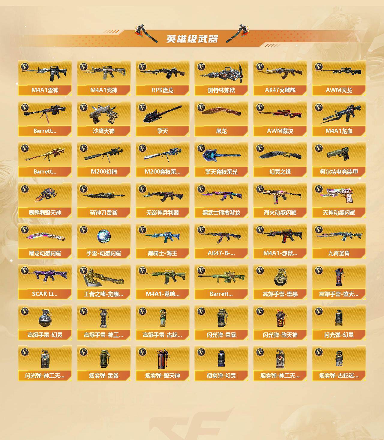 【英雄级武器】:AK47-火麒麟*2,M4A1-雷神,M4A1-死神*2,M4A1-龙血,无影-神兵利器,G36C-幻影,黑武士-锦绣游龙,金色蔷薇-古蛇迷踪,SCAR Light-玄豹,九霄圣角,烈火-动感闪耀,AK47-B-战神,黑骑士-海王*2,AK47-B-常胜将军,王者玄武-觉醒版,AWM-天龙,Barrett-毁灭,AWM-裁决,M200-幻神,Barrett-朱雀,M200-竞技荣光,RPK-盘龙,加特林-炼狱,沙鹰-天神*2,柯尔特-电竞装甲,天神-动感闪耀,修罗-古蛇迷踪,屠龙*3,麒麟刺-堕天神,擎天,幻灵之锋,擎天-竞技荣光,屠龙-动感闪耀,斩神刀-雷暴,王者之啸-觉醒版,王者冰锋-觉醒版,高爆手雷-雷暴,高爆手雷-堕天神,高爆手雷-幻灵,高爆手雷-神工天巧,手雷-动感闪耀,高爆手雷-古蛇迷踪,闪光弹-雷暴,闪光弹-