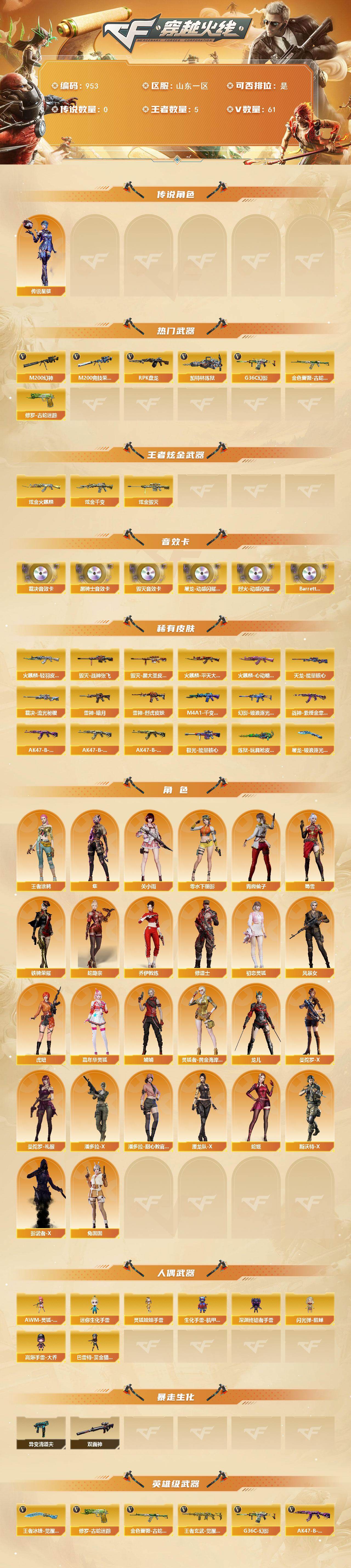 [15787516]山东一区-61V-5王者-3炫金 【传说角色】:传说星骇 【热门武器】:G36C-幻影,M200-幻神,金色蔷薇-古蛇迷踪,修罗-古蛇迷踪,M200-竞技荣光,RPK-盘龙,加特林-炼狱 【王者炫金武器】:炫金火麒麟,炫金千变,炫金毁灭 【音效卡】:屠龙-动感闪耀 音效卡,烈火-动感闪耀 音效卡,M4A1-黑骑士音效卡,Barrett-毁灭音效卡,AWM-裁决音效卡,Barrett-碧霄极光音效卡 【皮肤】:裁决-流光秘银,雷神-暗月,雷神-烈虎皮肤,火麒麟-轻羽皮肤,火麒麟-平天大圣,火麒麟-心动糖果,毁灭-战神张飞,毁灭-黑大圣皮肤,M4A1-千变-孔明皮肤,幻影-破浪逐光 皮肤,战神-紫绶金章皮肤*2,AK47-B-常胜将军-曹操*2,AK47-B-常胜将军-刘备,AK47-B-常胜将军-孙权,天龙-能量核心,极光-能量核心,炼狱-玩具枪皮肤,屠龙-破浪逐光 皮肤 【角色】:关小雨,隼,王者涂鸦,蛇隐宗,乔伊教练,修道士,初恋灵狐,风暴女,虎妞,嘉年华灵狐,娟娟,零-水下丽影,灵狐者-黄金海岸,龙儿,曼陀罗-X,曼陀罗-礼服,潘多拉-X,潘多拉-甜心教官,潜龙队-X,青霞仙子,蛇姬,斯沃特-X,蜀雪,铁骑荣耀,兔囡囡,影武者-X 【人偶武器】:AWM-灵狐-15周年嘉年华,迷你生化手雷*2,生化手雷-机甲核心,深渊终结者手雷,闪光弹-貂蝉,高爆手雷-大乔,巴雷特-赏金猎人,灵狐娃娃手雷*3 【暴走生化】:异变清道夫,双面神 【英雄级武器】:AK47-火麒麟*2,M4A1-雷神,M4A1-死神*2,M4A1-龙血,无影-神兵利器,G36C-幻影,黑武士-锦绣游龙,金色蔷薇-古蛇迷踪,SCAR Light-玄豹,九霄圣角,烈火-动感闪耀,AK47-B-战神,黑骑士-海王*2,AK47-B-常胜将军,王者玄武-觉醒版,AWM-天龙,Barrett-毁灭,AWM-裁决,M200-幻神,Barrett-朱雀,M200-竞技荣光,RPK-盘龙,加特林-炼狱,沙鹰-天神*2,柯尔特-电竞装甲,天神-动感闪耀,修罗-古蛇迷踪,屠龙*3,麒麟刺-堕天神,擎天,幻灵之锋,擎天-竞技荣光,屠龙-动感闪耀,斩神刀-雷暴,王者之啸-觉醒版,王者冰锋-觉醒版,高爆手雷-雷暴,高爆手雷-堕天神,高爆手雷-幻灵,高爆手雷-神工天巧,手雷-动感闪耀,高爆手雷-古蛇迷踪,闪光弹-雷暴,闪光弹-