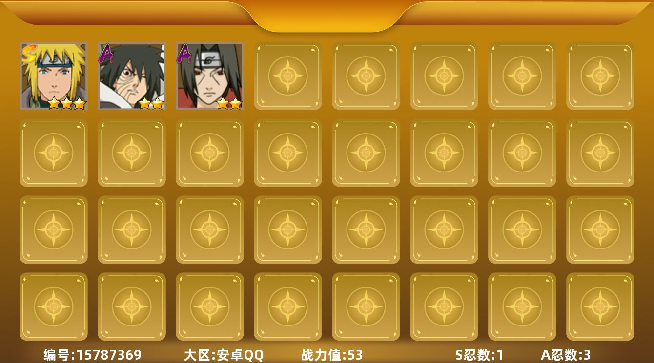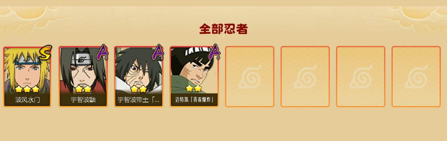 【A级忍者】:宇智波鼬(2星),宇智波带土「暴怒」(2星),迈特凯「青春爆炸」(2星)