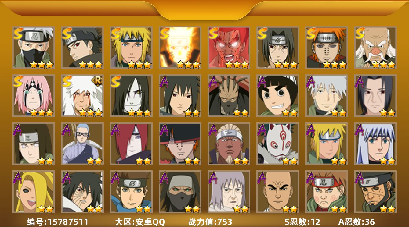【S级忍者】:大野木「忍界大战」(3星),春野樱「忍界大战」(3星),宇智波鼬「须佐能乎」(3星),宇智波止水「须佐能乎」(3星),旗木卡卡西「须佐能乎」(3星),自来也「舞之豪杰」(3星),大蛇丸(3星),波风水门(3星),漩涡鸣人「九喇嘛连结」(3星),迈特凯「死门」(3星),佩恩「天道」(3星),漩涡鸣人·宇智波佐助(3星)