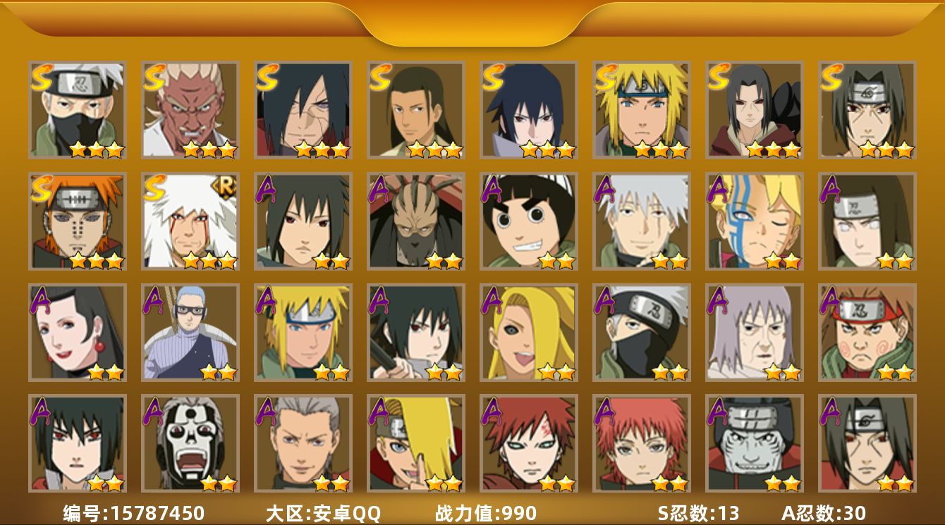 [15787450]13S级忍者数-30A级忍者数 【S级忍者】:宇智波鼬「秽土转生」(3星),宇智波斑「秽土转生·解」(3星),艾「忍界大战」(3星),宇智波鼬「须佐能乎」(3星),旗木卡卡西「须佐能乎」(3星),千手柱间「木叶创立」(3星),自来也「舞之豪杰」(3星),自来也「传说中的三忍」(3星),波风水门(3星),佩恩「天道」(3星),宇智波佐助「永恒万花筒」(3星),波风水门「九喇嘛连结」(3星),漩涡鸣人·宇智波佐助(3星) 【A级忍者】:波风水门「青年」(2星),迪达拉(2星),迪达拉「秽土转生」(2星),飞段(3星),飞段「死司凭血」(2星),干柿鬼鲛(5星),漩涡博人「桃式显现」(2星),迈特凯(5星),旗木卡卡西「忍界大战」(2星),旗木卡卡西「幻之真容」(2星),桃地再不斩「秽土转生」(2星),我爱罗「疾风传」(4星),蝎(4星),蝎「绯流琥」(2星),猿飞阿斯玛(5星),宇智波鼬(2星),宇智波佐助「须佐能乎」(2星),宇智波佐助「万花筒写轮眼」(2星),日向宁次「忍界大战」(2星),长十郎「六代目水影」(2星),李洛克「忍界大战」(2星),黑土「博人传」(2星),秋道丁次「忍界大战」(2星),千代「近松十人卫」(2星),土台「忍界大战」(2星),不缘(2星),宇智波泉奈(2星),大野木「侠隐江湖」(2星),巳月「仙人模式」(2星),迈特凯「青春爆炸」(2星)