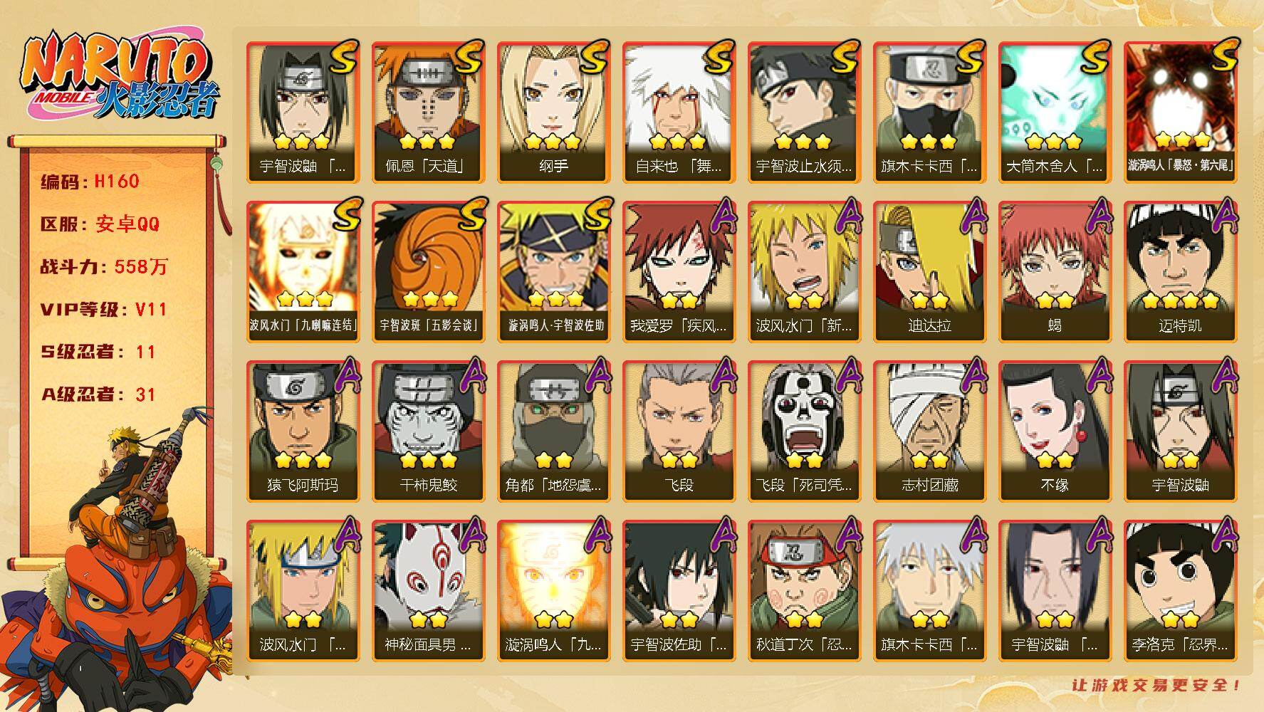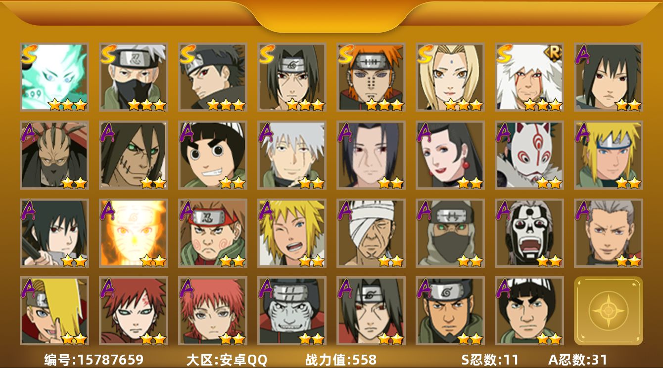 [15787659]11S级忍者数-31A级忍者数 【S级忍者】:宇智波鼬「须佐能乎」(3星),宇智波止水「须佐能乎」(3星),旗木卡卡西「须佐能乎」(3星),自来也「舞之豪杰」(3星),纲手(3星),佩恩「天道」(3星),大筒木舍人「最终章」(3星),漩涡鸣人「暴怒·第六尾」(3星),波风水门「九喇嘛连结」(3星),宇智波斑「五影会谈」(3星),漩涡鸣人·宇智波佐助(3星) 【A级忍者】:波风水门「青年」(2星),波风水门「新春限定」(2星),迪达拉(2星),飞段(2星),飞段「死司凭血」(2星),干柿鬼鲛(3星),漩涡鸣人「九尾查克拉」(2星),机械鸣人「初始形态」(2星),迈特凯(4星),旗木卡卡西「幻之真容」(2星),桃地再不斩「秽土转生」(2星),我爱罗「疾风传」(2星),蝎(2星),蝎「绯流琥」(2星),角都「地怨虞」(2星),角都「秽土转生」(2星),猿飞阿斯玛(3星),宇智波鼬(2星),宇智波鼬「夏日限定」(2星),宇智波佐助「须佐能乎」(2星),宇智波佐助「侠隐江湖」(2星),宇智波带土「漂泊浪客」(2星),神秘面具男「忍者之路」(2星),李洛克「忍界大战」(2星),秋道丁次「忍界大战」(2星),神农「羁绊」(2星),志村团藏(2星),不缘(2星),宇智波泉奈(2星),巳月「仙人模式」(2星),迈特凯「青春爆炸」(2星)